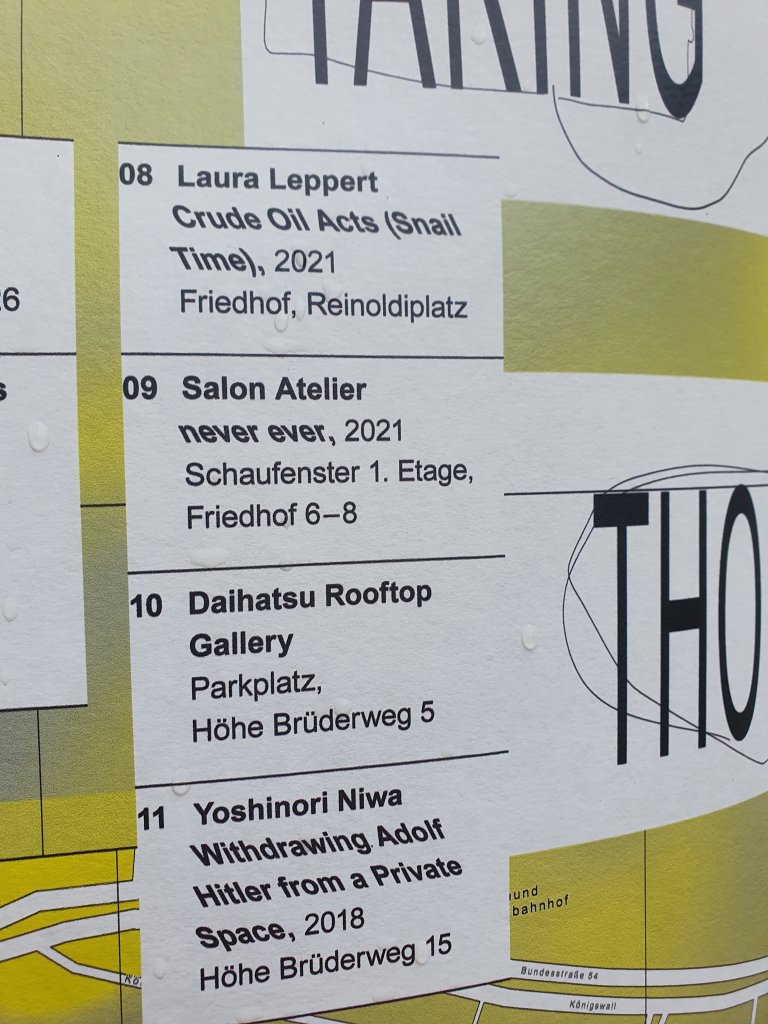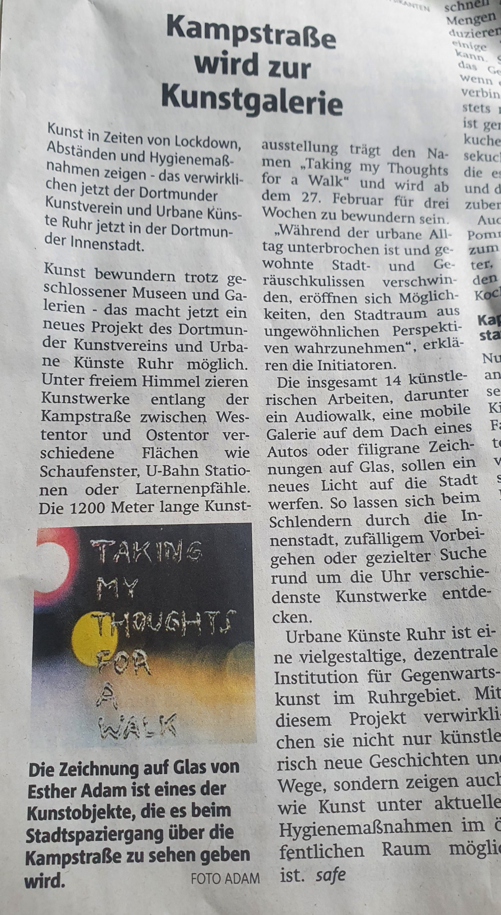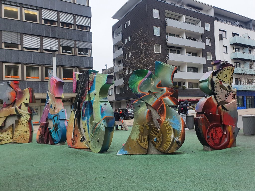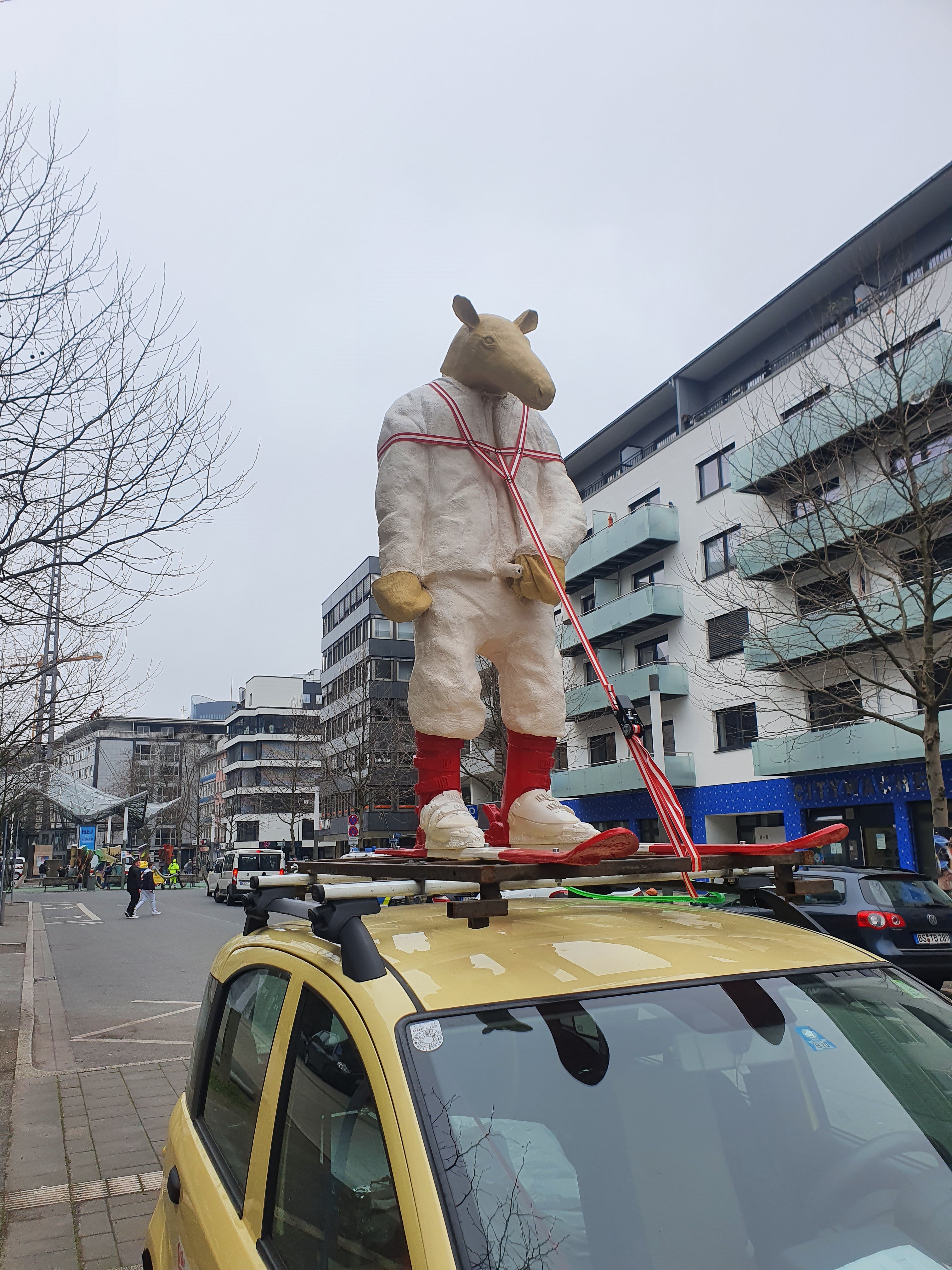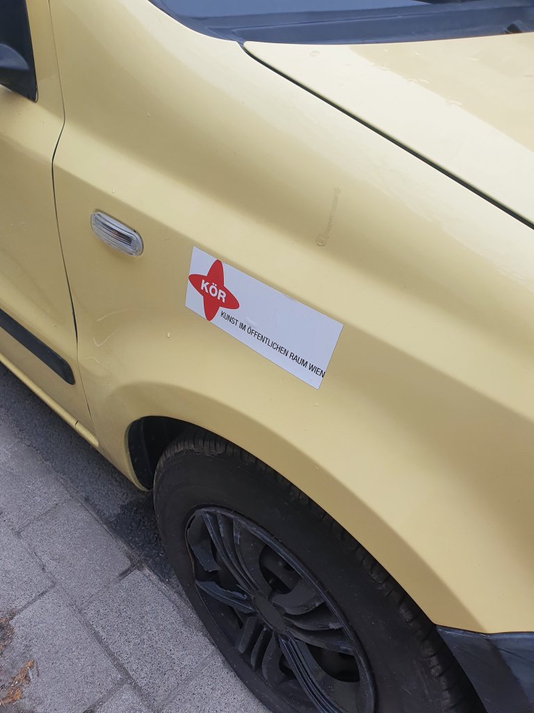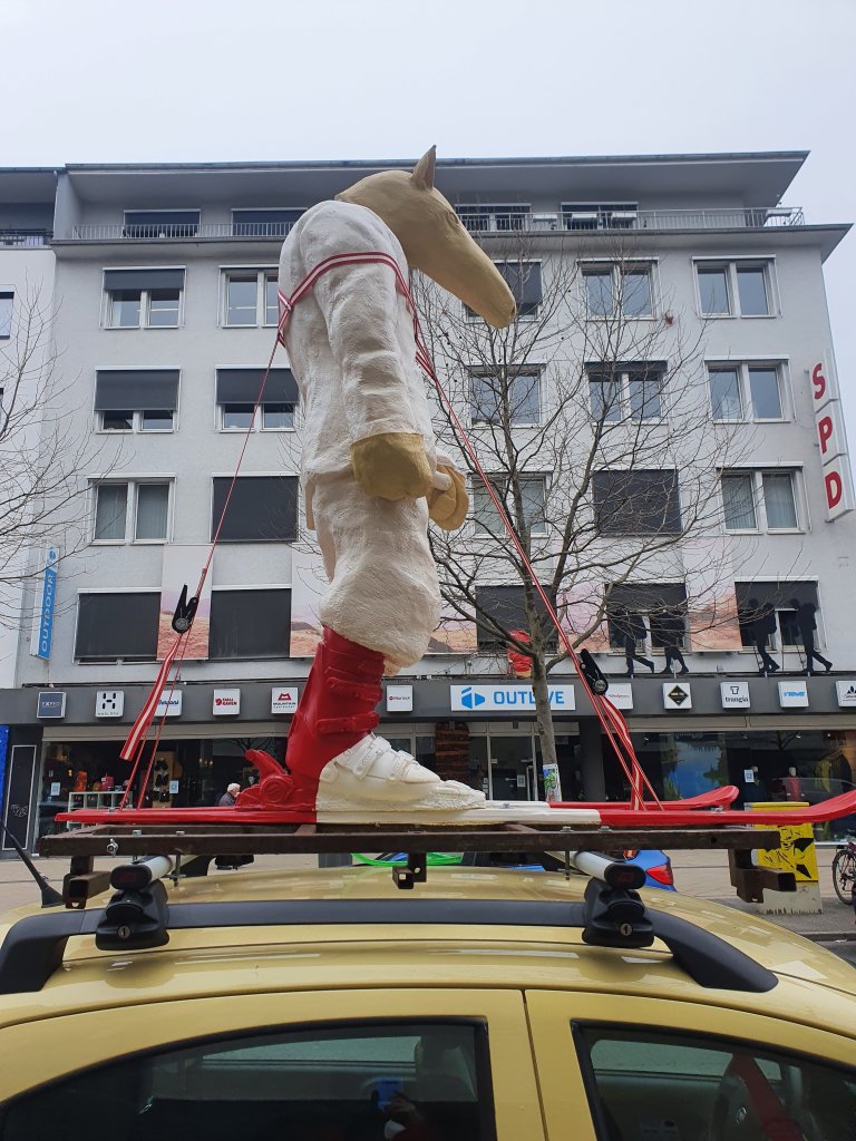 Ruhr NachrichtenKÖR=Kunst im öffentlichen Raum: was vollmundig angekündigt wurde, fand ich eher etwas enttäuschend mager – wobei mich diese Figur/Skulptur aus der Daihatsu Rooftop Gallery amüsierte. Man fand sie nicht leicht, an der östlichsten Stelle der Kampstr., am Übergang zum Brüderweg, scheinbar zufällig auf einem Auto angebracht, das dort parkte. Ein Gag, aber wahrscheinlich auch der Grund dass ich nicht alles von dieser „Kunstmeile“ gefunden habe. Alles von den 14 Kunstwerken, die der Dortmunder Kunstverein und die Urbanen Künste Ruhr ausgesucht haben, scheint ziemlich versteckt, dezent im Hintergrund…