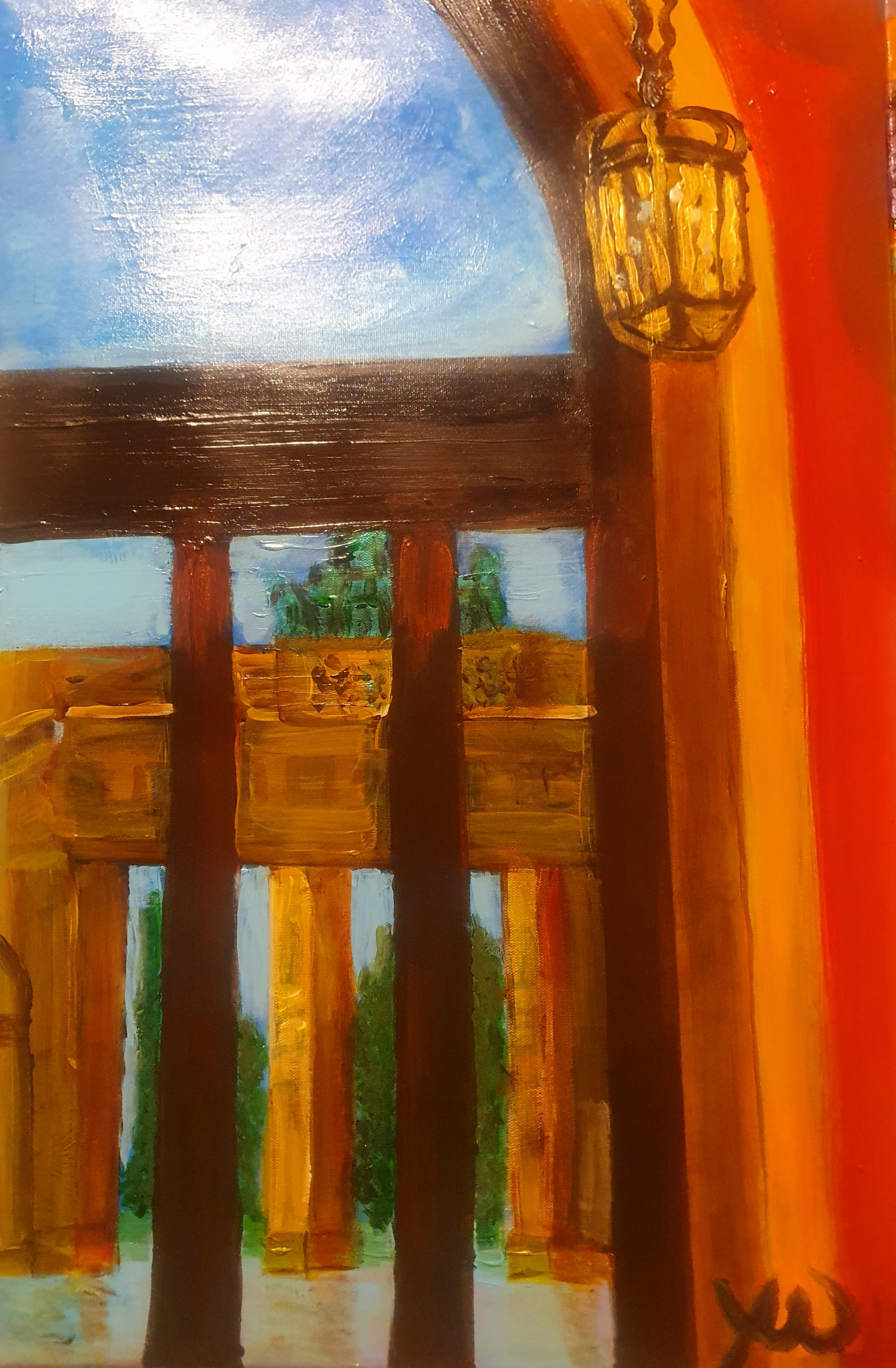 „Das Brandenburger Tor vom Hotel Adlon aus gesehen“ Acryl auf Leinwand 40 x 60 – man sieht das Brandenburger Tor so häufig zur Zeit im Fernsehen. Diesen Blickwinkel hatte ich schon bei meinem letzten Berlinaufenthalt 3/2019 spannend gefunden, als ich an einem frühen Abend im Restaurant des Adlons war – Und jetzt erst umgesetzt😉