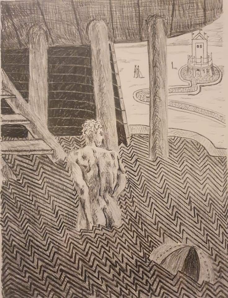 @ Hamburger Kunsthalle – gesehen am 14.3.21 (der letzte Tag der Max Beckmann Ausstellung „weiblich-männlich“) und außerdem ein Tag für die Ausstellung „Giorgio de Chirico – magische Wirklichkeit“, in beiden Bildern spielen Badekabinen eine Rolle: bei de Chirico mit dem männlichen Protagonisten heißt die Lithographie von 1934 „unter der geheimnisvollen Badekabine“, bei Max Beckmann heißt die Kaltnadelradierung auf rötlichem Papier von 1924 einfach nur „Badekabine“. Das Geheimnis ist für de Chirico sein ganzes langes Künstlerleben lang (1888-1978) etwas ganz Typisches, Max Beckmann (1884-1950) hat zu vielen Themen – und natürlich auch zur Badekabine – einen sehr sinnlichen Zugang.