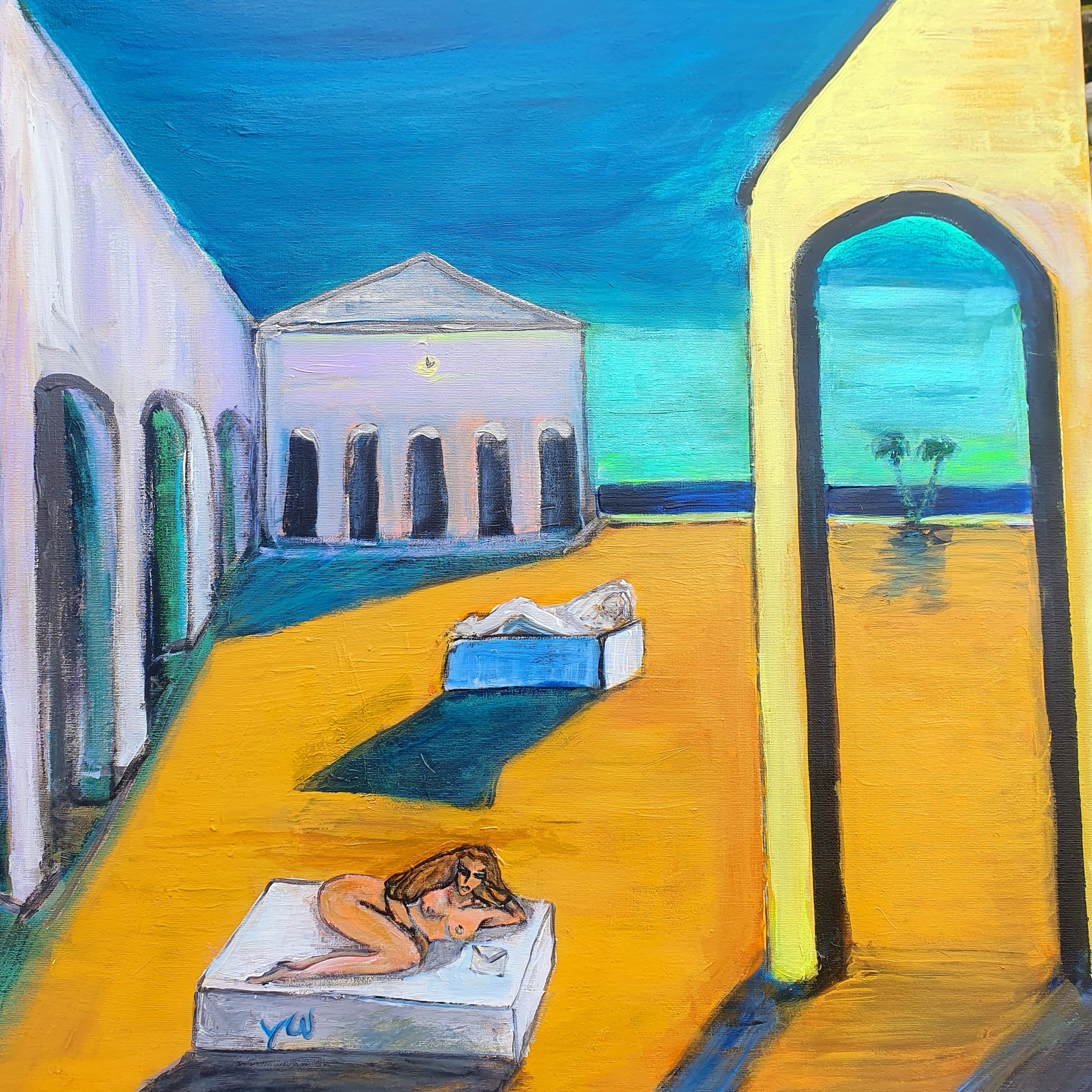 „Ariadne und der Brief“ Acryl auf Leinwand 70 x 70: in einer Landschaft, die 3 Gemälden von de Chirico nachempfunden ist, räkelt sich eine an Max Beckmanns Halbakt von 1918 (auch „der Brief“ genannt) orientierte Nackte und belebt so die menschenleere Stadtlandschaft. Sie wartet…auf den Schreiber des Briefes oder den Maler/die Malerin, die sie malen wird.Hier zusammen mit einer Collage von Holger Krüssmann, die farblich sehr gut dazu passt – selbst in der Extremhängung des Musée Yvonne