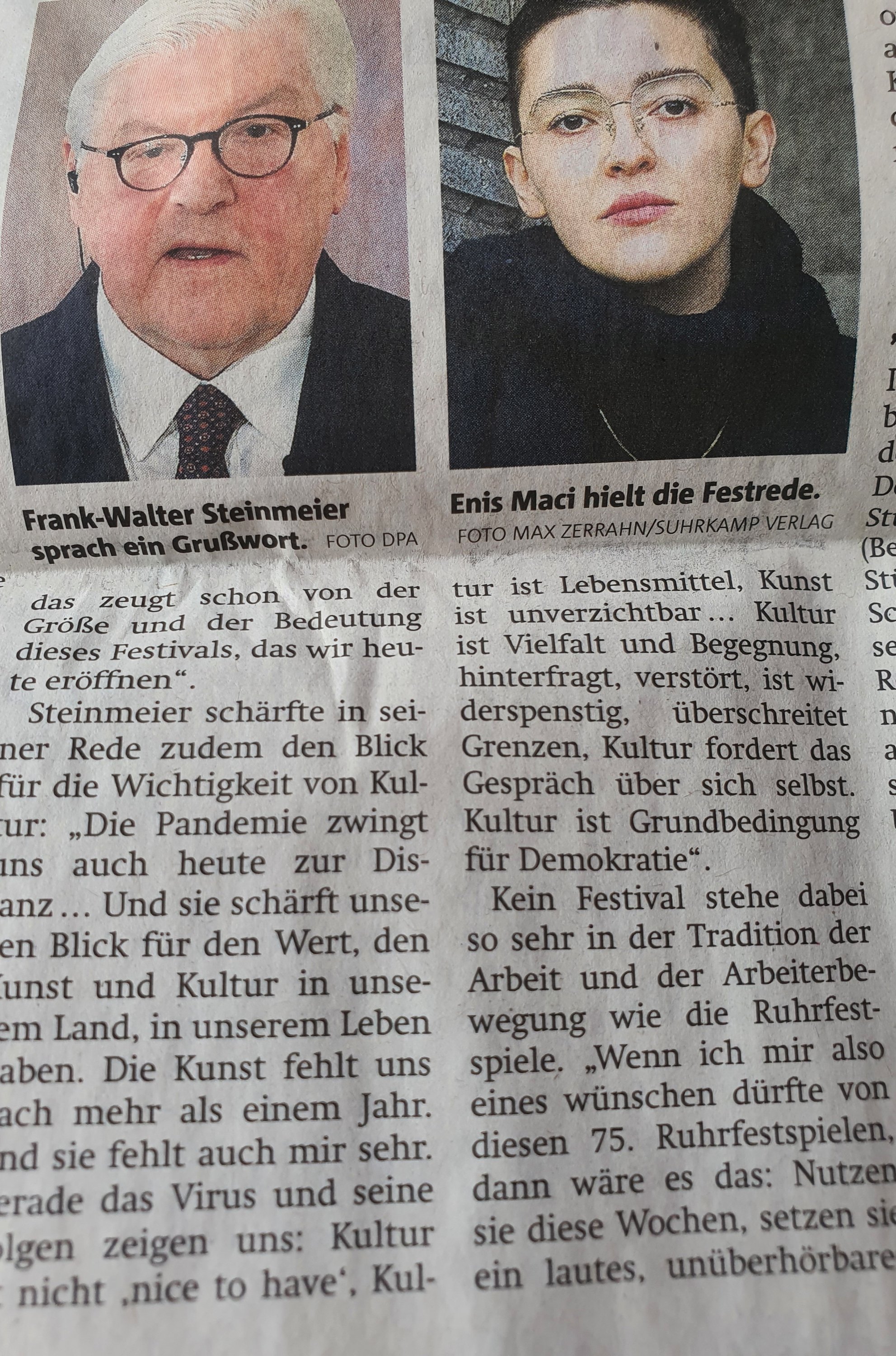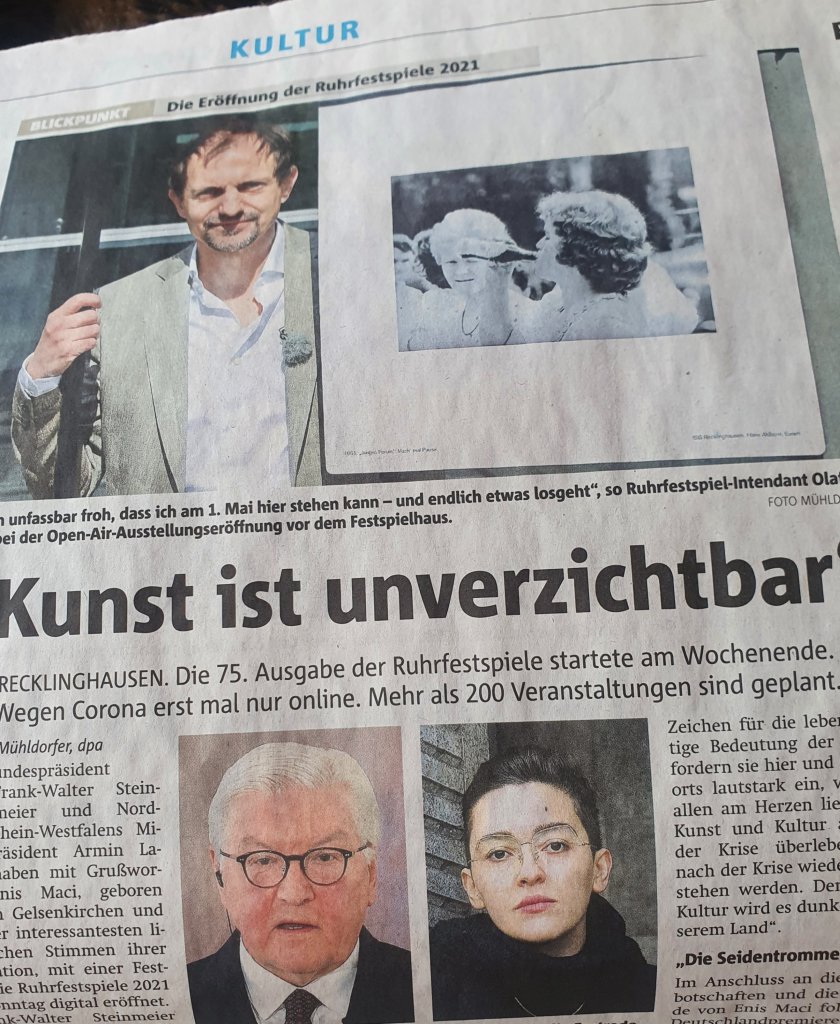 aus Steinmeiers Eröffnungsrede bei den diesjährigen Ruhrfestspielen in Recklinghausen (zitiert aus Ruhr Nachrichten 3.5.21)“Die Kunst fehlt uns nach mehr als einem Jahr…Kultur ist nicht ’nice to have‘, Kultur ist Lebensmittel. Kunst ist unverzichtbar….“