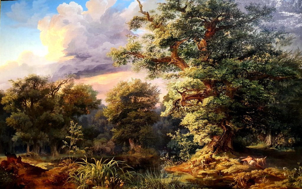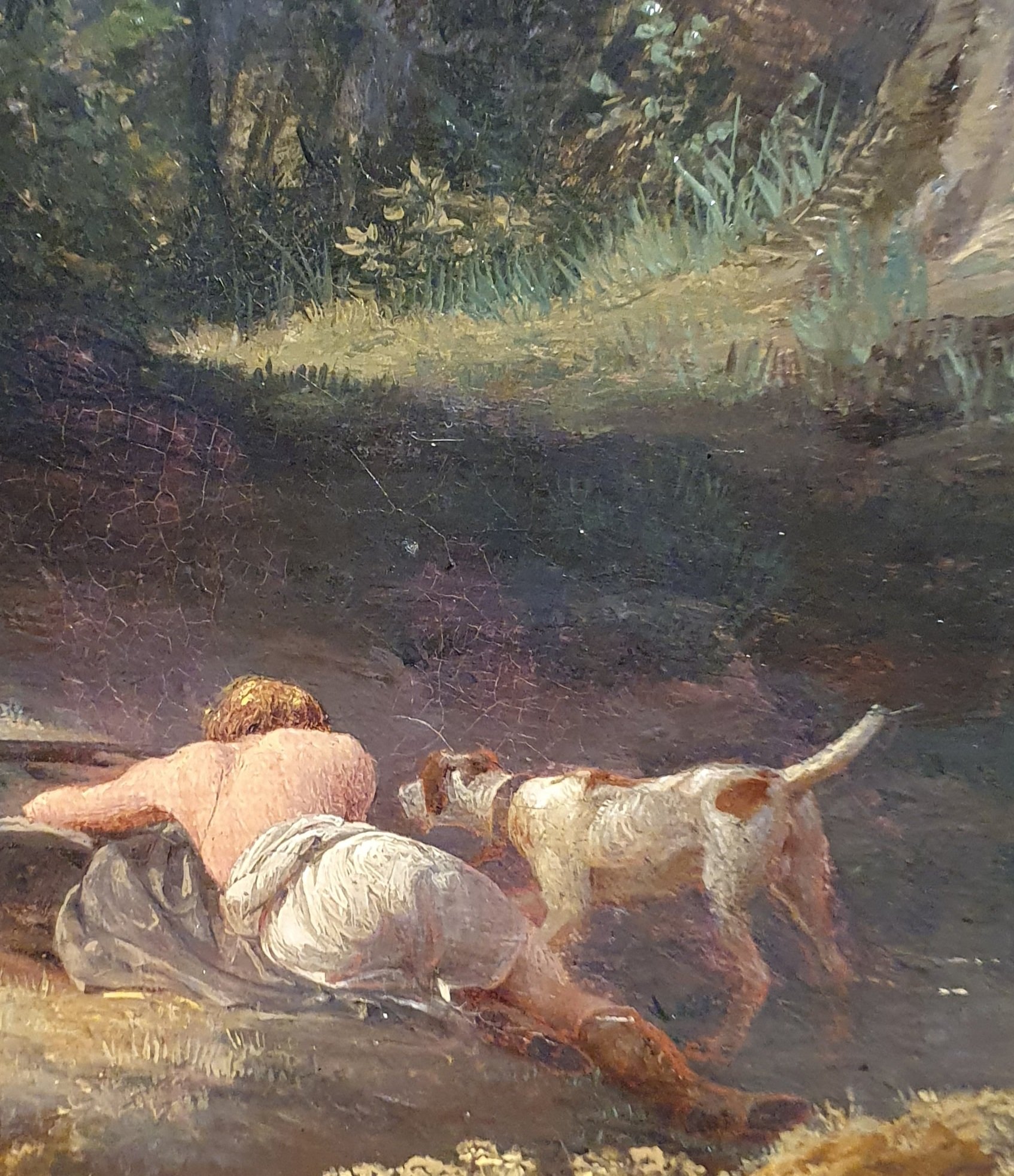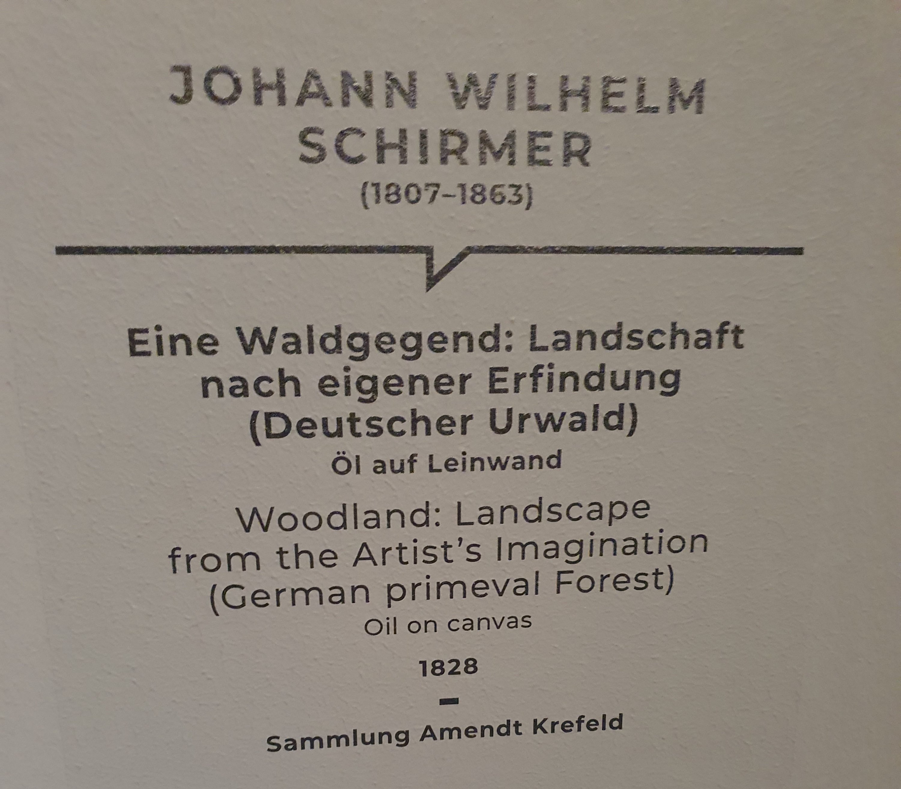 Dieses Detail aus dem sehr komplexen Bild „Waldgegend – deutscher Urwald“, 1828 von Johann Wilhelm Schirmer gemalt (fotografiert im April 2021 im Düsseldorfer Kunstpalast in der Ausstellung „Caspar David Friedrich und die rheinischen Romantiker“) zeigt auf wundervolle Weise die innige Verbindung von Mensch und Hund.