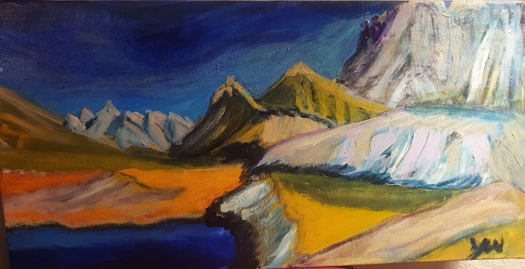 Oder ist es doch kein Diptychon? Nur zufällig parallel entstanden und mit gleichen Abmessungen(60×30)? Aber doch, da besteht eine inhaltliche Gemeinsamkeit: mittig/rechts oben in der Alpenlandschaft („magic mountains“ no. 27) sind 2 violette Gipfel die zum Mond im türkis-blauen Himmel etwa parallel liegen. Dort ist das Mädchen verborgen vom 2. Bild „Cachée“.