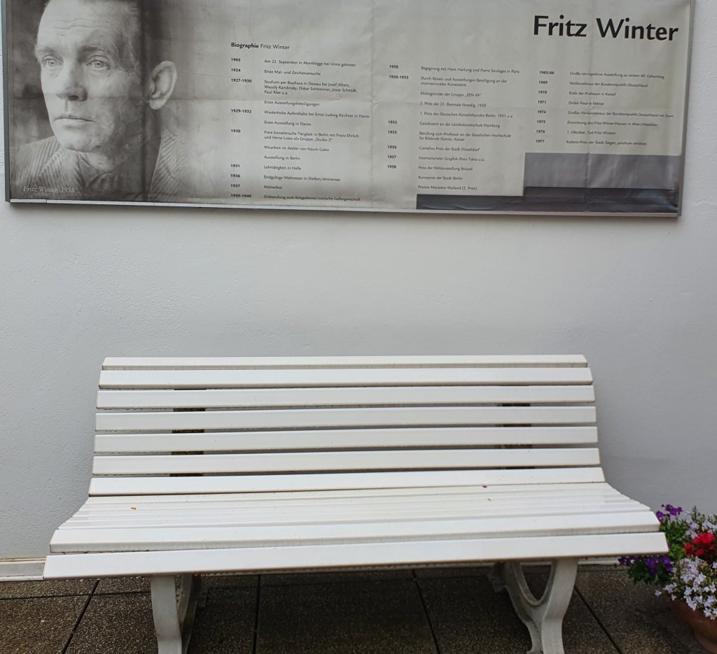 Besuch im Fritz Winter Haus: im früheren Elternhaus des Künstlers, das heute von seiner Nichte, die es mit ihm zusammen noch konzipiert hat, Besuchern präsentiert wird, finden sich außer Fritz Winter (1905 – 1976) Bildern mit dem charakteristischen schwarzen Strich in charmant-angenehmer Wohnzimmeratmosphäre auch andere informelle Werke: zur Zeit von den Künstlern Hans Jaenisch (1907-1989) und Heiko Herrrman (geb. 1953) – teilweise stehen sie zum Verkauf. Auch ein kleiner Skulpturengarten hinter dem Haus verbreitet Charme.Heiko HerrmannHans Jaenisch