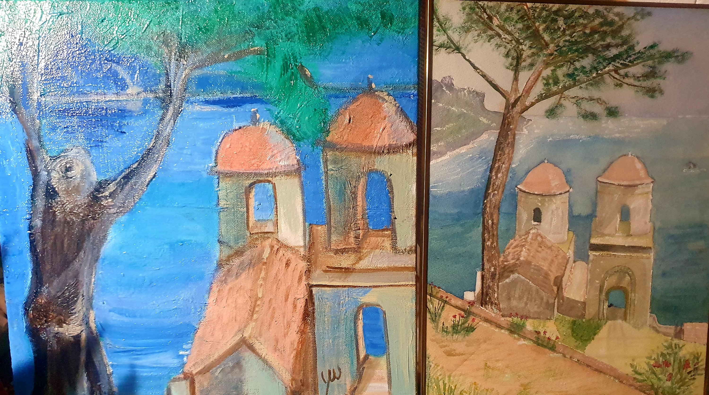 Von Yvonne Wilken: Inspiration identisch (Küstenlandschaft mit Kirche bei Amalfi) – Materialien und Eindruck verschieden: links Acryl auf Leinwand 40 x 40 von 2021 (der Nachdruck liegt auf dem menschlich erscheinenden Baum, den hochaufragenden Türmen und den Farben des Meeres) – rechts Aquarell 30 x 40 von 1989 (die Betonung liegt auf den Tieren – Delphin und Hund – und den sanften Farben der Landschaft)