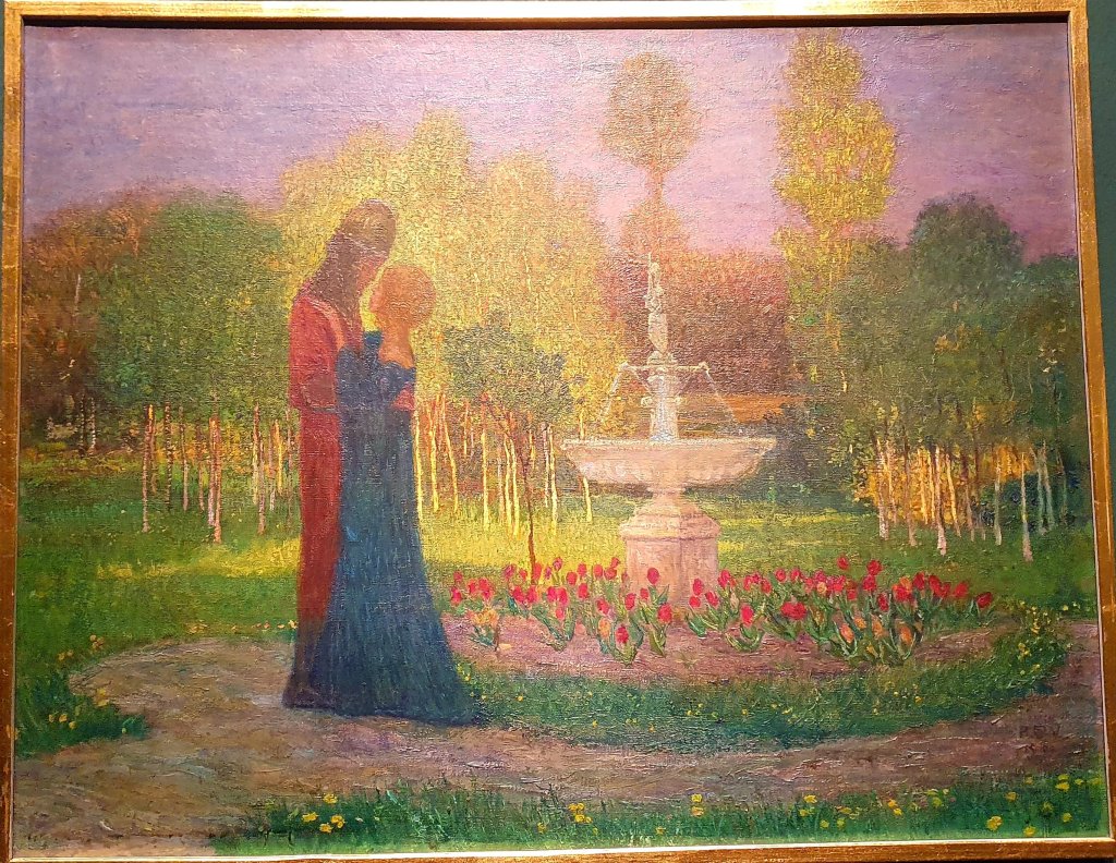 Hier wird nicht geküsst, sondern in der Umarmung innig geschaut, 1901 geschaffen vom in Bremen geborenen Künstler Heinrich Vogeler. Im Ritterkostüm malte er sich und seine Frau in seinem Garten in Worpswede. Zu sehen in der Sammlung der Bremer Kunsthalle in der Ausstellung REMIX