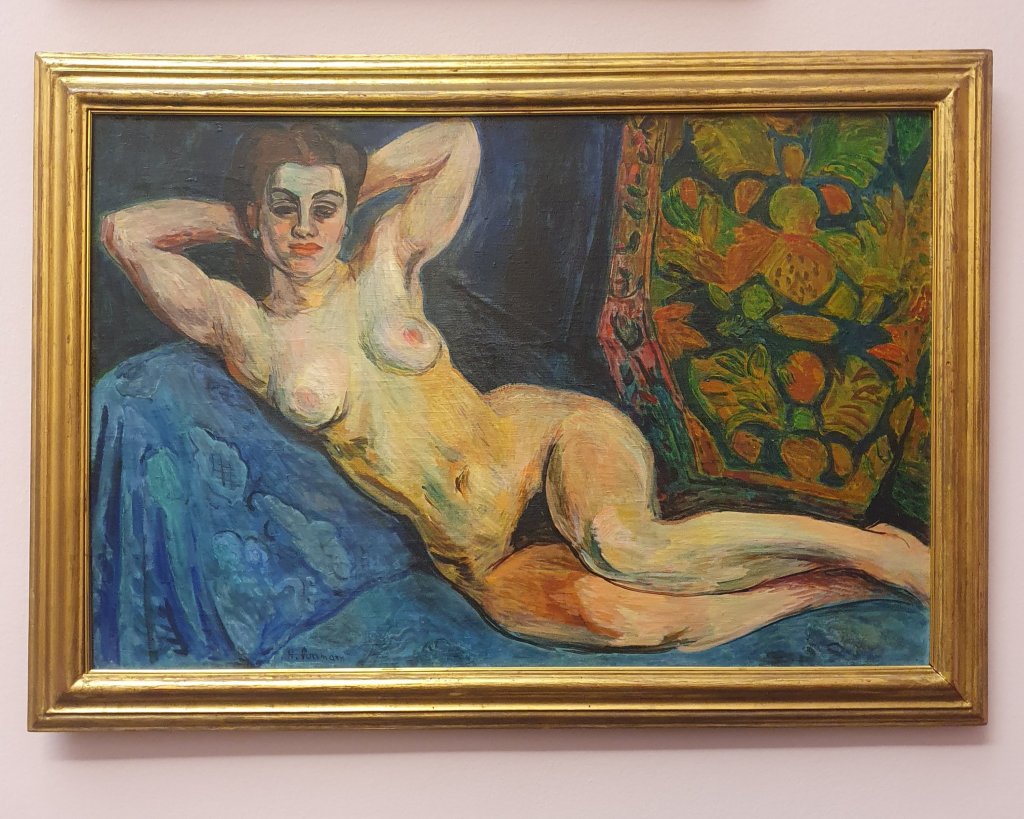 Der deutsche Maler Hans Purrmann (1880-1966), ein Schüler von Franz von Stuck und späterer Freund von Henri Matisse, hat diesen „liegenden Akt auf blauer Decke“ 1938 gemalt und wurde als entartet gebrandmarkt. Er verließ bald darauf Deutschland und lebte fortan in der Schweiz. Vor kurzem gab es in Bielefeld eine Ausstellung seiner Werke, die ich leider coronabedingt versäumt habe. Umso mehr freute ich mich letztens in der Bremer Kunsthalle über sein Bild