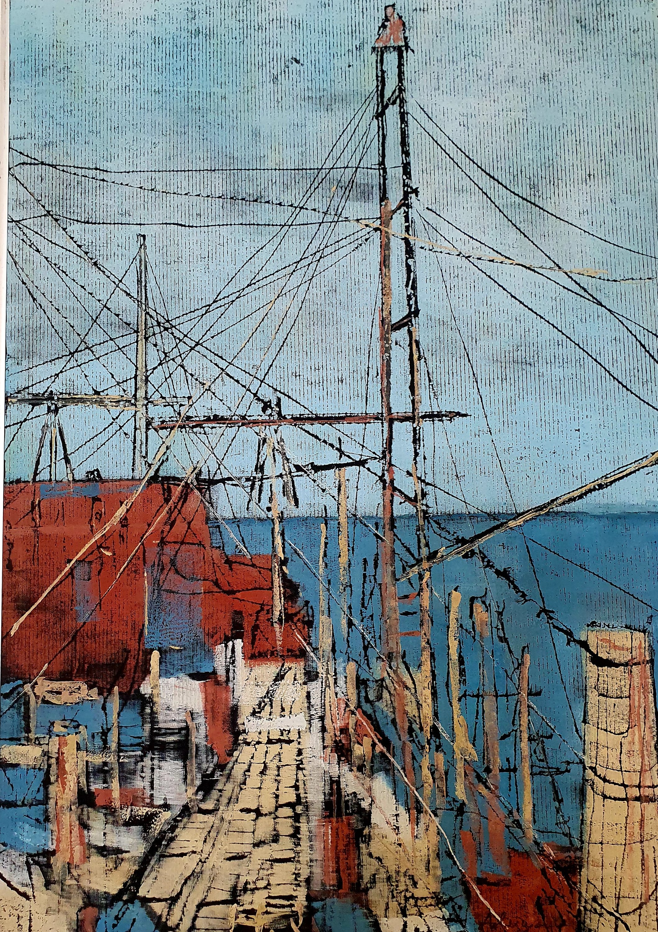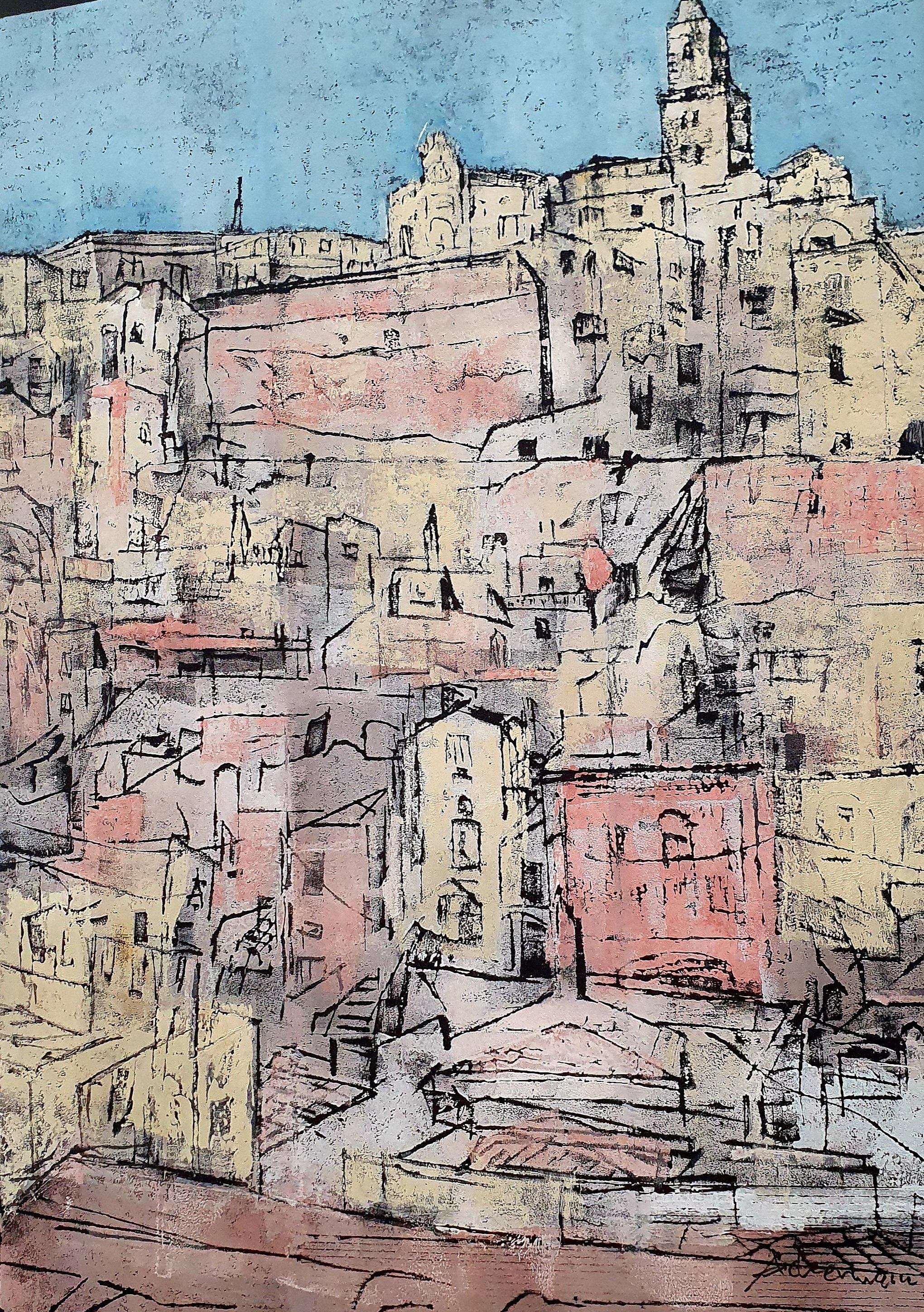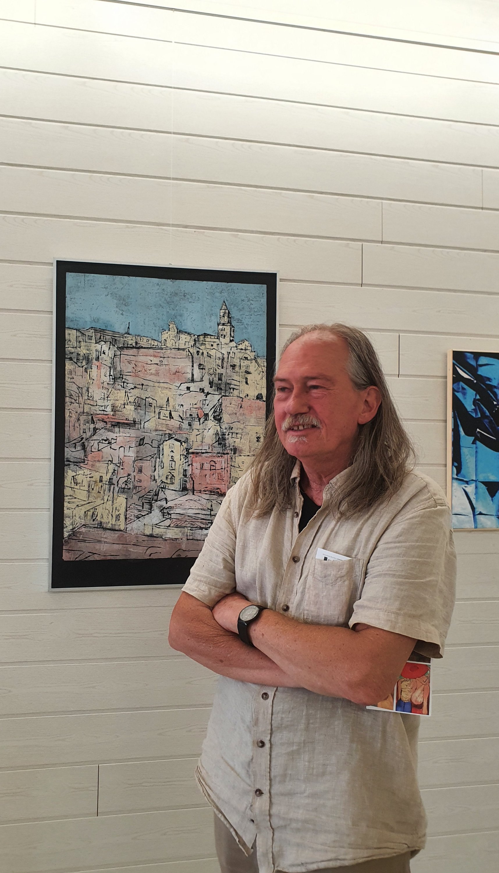 Vor seinem – meinem Lieblingsbild – Linol-Styropordruck auf schwarzem Karton „Matera“ von 2021 und vor dem Portrait eines typischen Boots, dem Trabucco, und der Brauerei