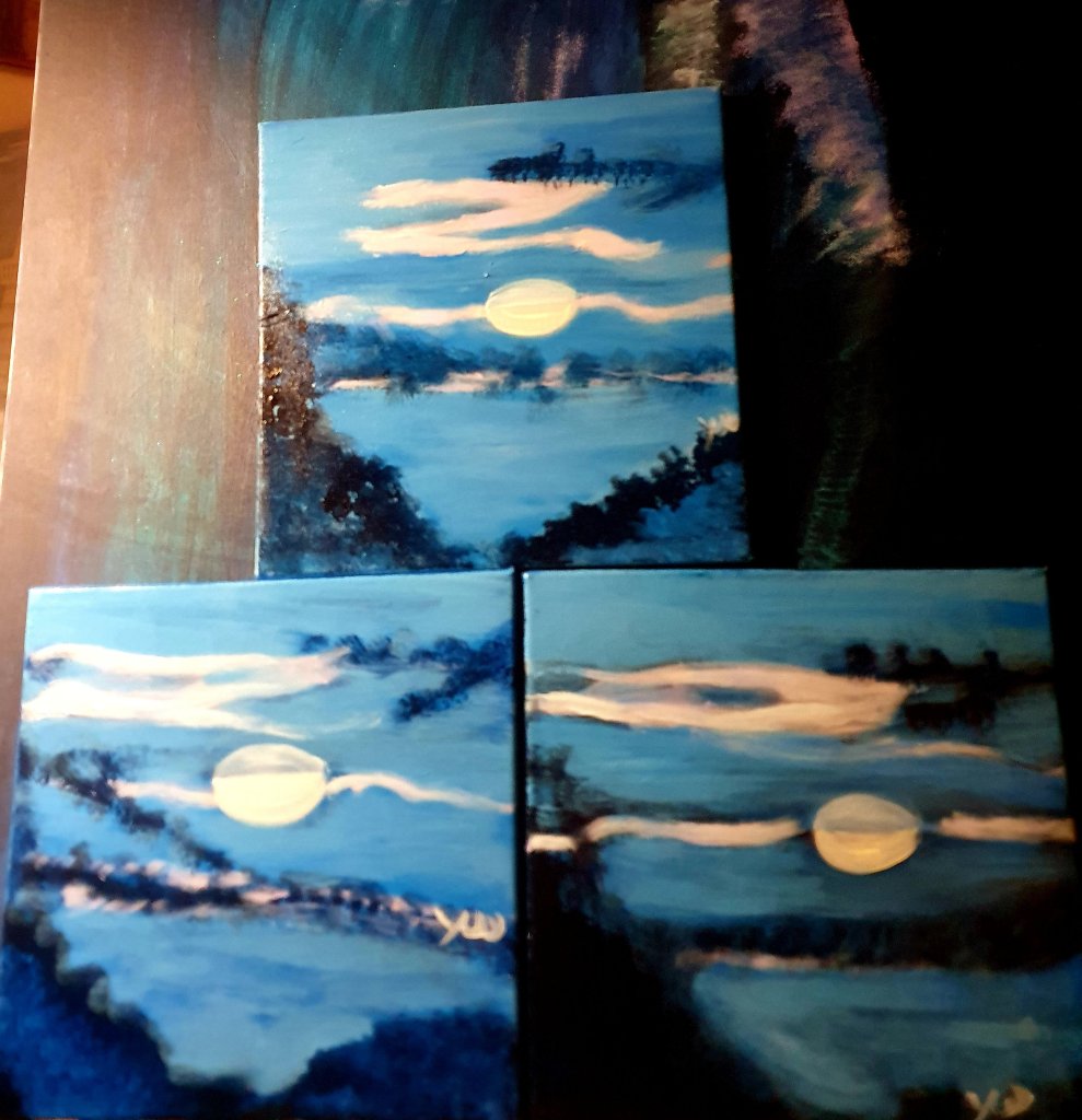 Ein Auftragsbild: 3 mal ein annähernd gleiches Gemälde vom bläulich-silbrig scheinenden Mond am Sommerhimmel „Blue Moon“ vom Auftraggeber, der die frühe Abendstimmung fotografiert hat, bereits akzeptiert…
