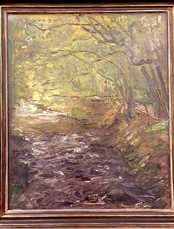 (-1932) hier mit seinem Bild „Bach im Walde“ von 1913 (gesehen im Bochumer Museum unter Tage, Nov. 2019). Es zeigt deutlich, dass Slevogt dem deutschen Impressionismus zugeordnet werden kann. Man weiß von ihm, dass er ähnlich wie Max Liebermann und Lovis Corinth sich der Freiluftmalerei verschrieben hatte. Der wesentliche Teil seiner Kunst entstand nicht im Atelier, sondern in „the open air“