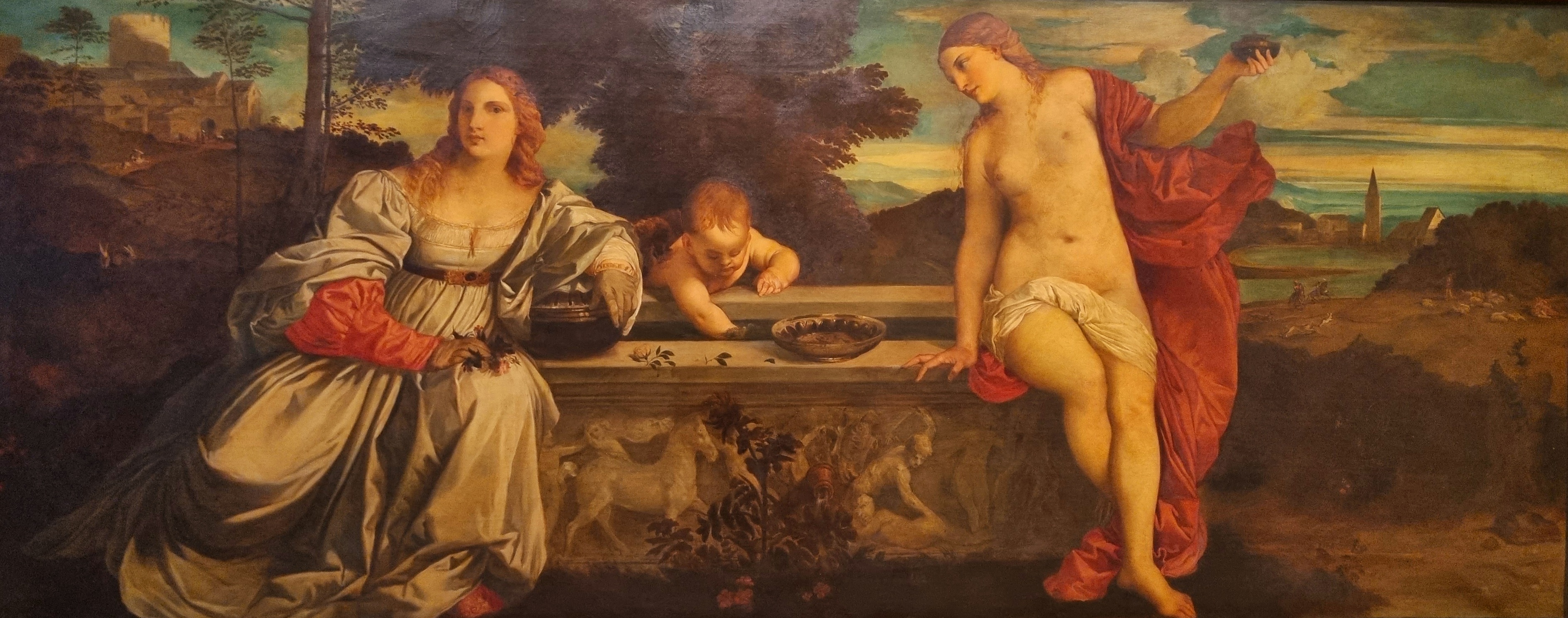 Obwohl der Titel dieses Bildnisses nach Tizian von August Wolf (1842-1915) aus dem Jahr 1890 „die himmlische und die irdische Liebe“ lautet, haben Tizian und im Auftrag des Oldenburger Großherzogs Nikolaus Friedrich Peter auch Wolf die Darstellung zweier Venusgestalten abgezielt: Venus coelestis und Venus vulgaris. Im Oldenburger Schloss noch bis zum 24.10. in der Ausstellung „Licht des Südens, Künstler sehen Italien“