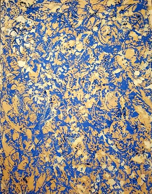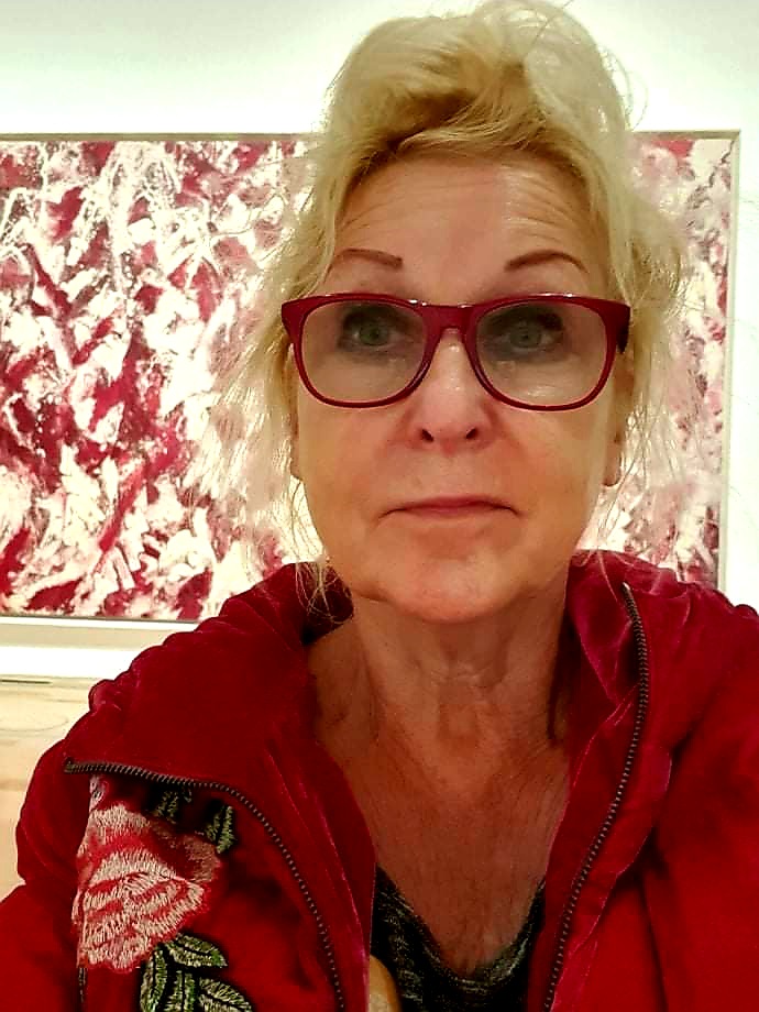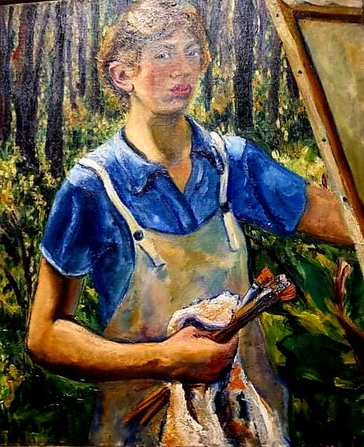 Lee Krasner, geboren am 27.10.1908 (gestorben 1984), amerikanische Malerin und Ehefrau des Malers Jackson Pollock, hatte genau vor 2 Jahren (Okt. 2019) eine Ausstellung in der Frankfurter Schirnkunsthalle. Da es so gut zu meiner roten Samtjacke passte, posierte ich vor ihrem großformatigen Bild „Another Storm“, sah auch „Through Blue“, beide von 1963, und bewunderte ihr Selbstportrait von 1928. Ich erinnere mich, dass ihre spätere Methode zu malen, darauf zurückging, dass sie die großformatigen Leinwände ihres verstorbenen Ehemannes geerbt hatte und nur mit dem Pinsel in der Hand hoch springend die Leinwand mit Farbe bedecken konnte. So entwickelte sie diesen neu-pointillistischen Stil.