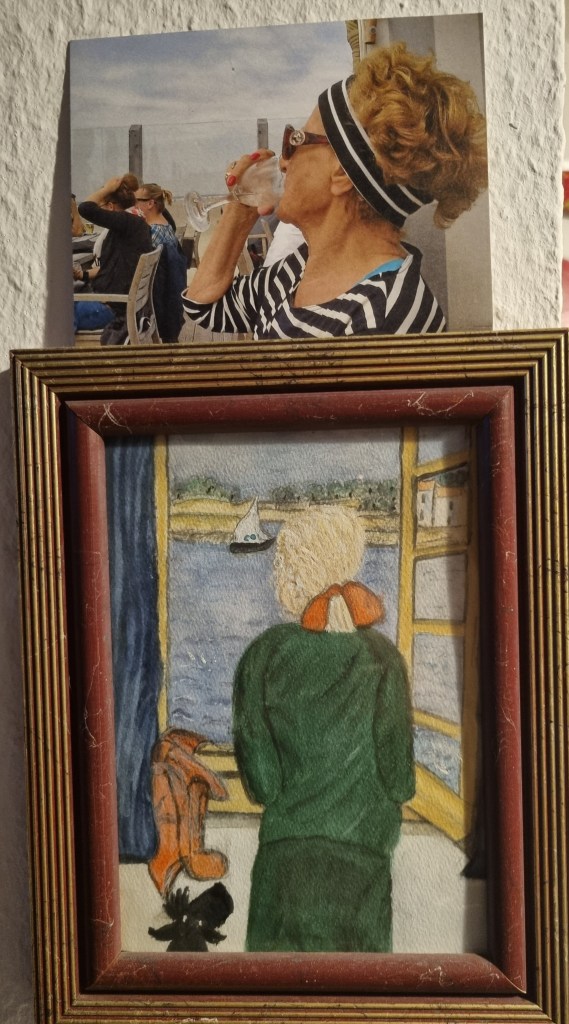 heute ist der 7. Todestag meiner Mutter, Karola Wilken, das linke Foto von ihr klemmt über einem ihrer Portraits von mir (Aquarell, 200?), und unter dem rechten Foto sieht man mein Bild „inside the museum/Carol’s eyes“, das von ihr inspiriert ist und zur Zeit in der Ausstellung der Galerie PIC-TURA, Witten, auf dem Schnee 29, zu sehen ist. Heute werde ich in unseren Öffnungszeiten 17.30-19.00 Uhr auch anwesend sein.