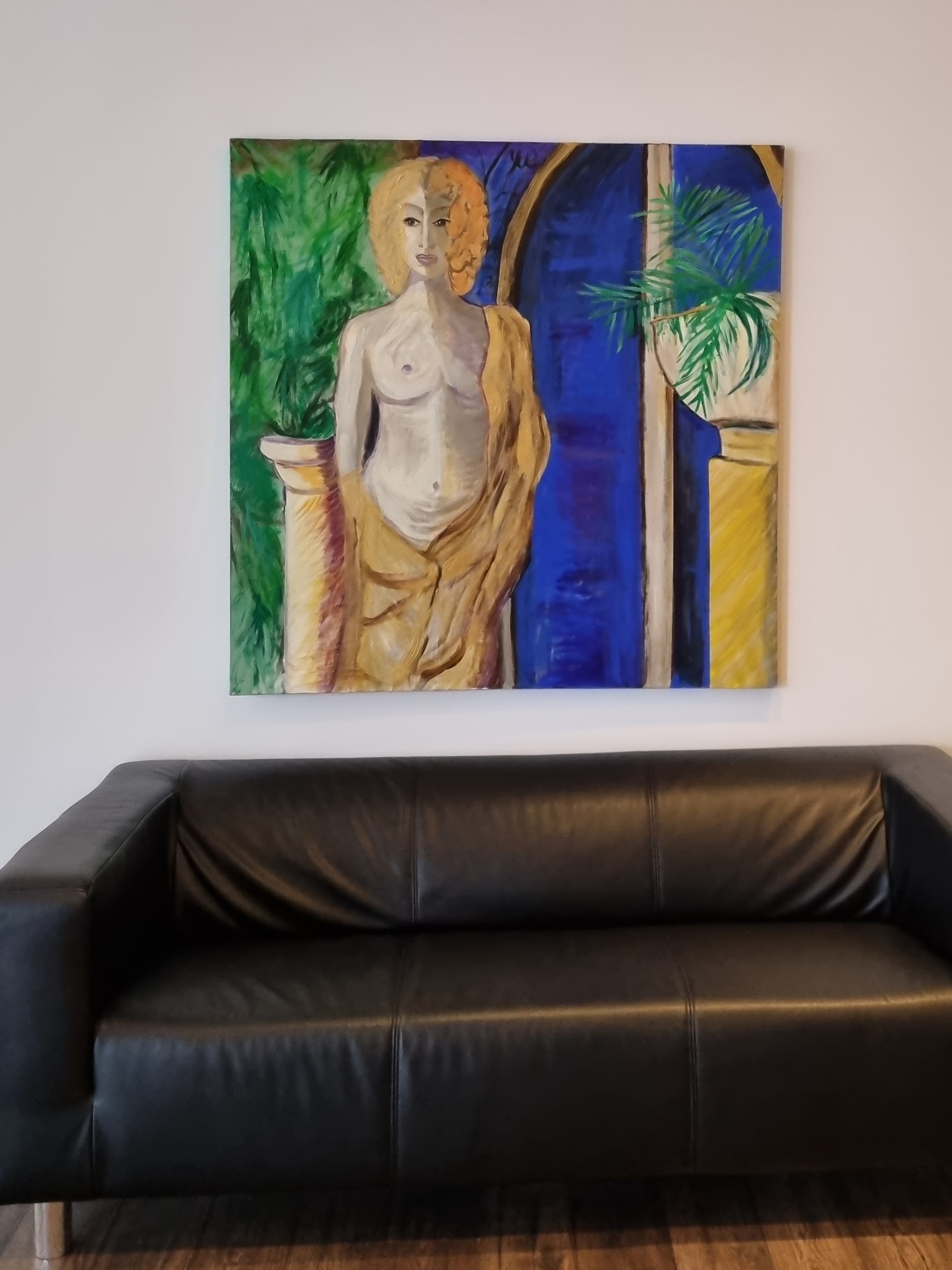 Das YvonneWilkenPainting „la Nocturne. Marmor wird lebendig“ 2019, Acryl auf Leinwand, 120×120, antwortet auf die Frage, wie Skulpturen die Nacht im Museum erleben (sie werden lebendig und öffnen ihre violetten Augen). Meine Große hängt jetzt im Terra Sports Studio Phoenixsee