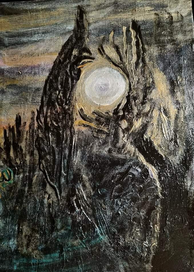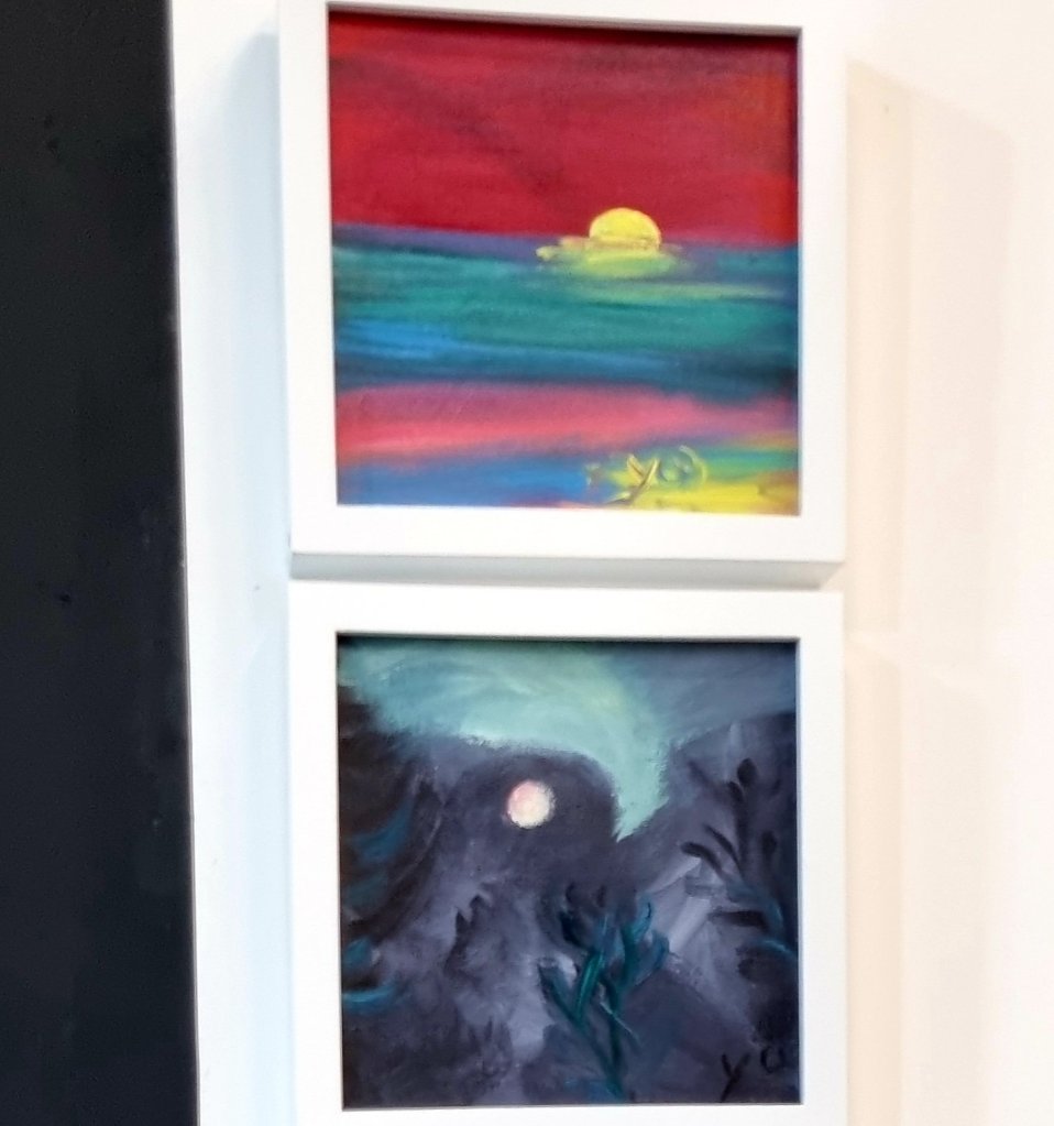 full moon in 4 Variationen: die 1.steht noch auf meiner Staffelei und heißt „Wintermeer“ (70×50), die 2. links darunter ist von 2019, 30×40, gerahmt und hängt in der PIC-TURA Galerie, Witten, Auf dem Schnee 29. Variationen 3 und 4 sind von 2022, heißen „red sky“ und „full moon“, 20×20 und sind zur Zeit in der Wintergalerie am Westenhellweg 86/88 zu sehen. Die 5. Version des Vollmondes ist der „Schneemond“, der in echt heute bzw. morgen nacht am Himmel steht🌝