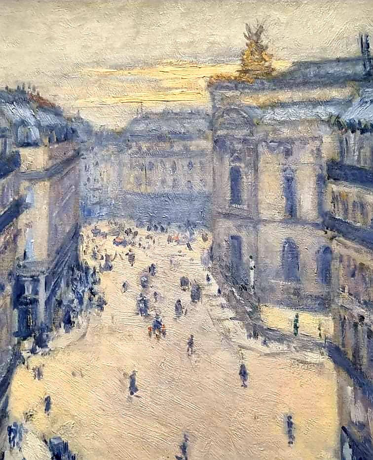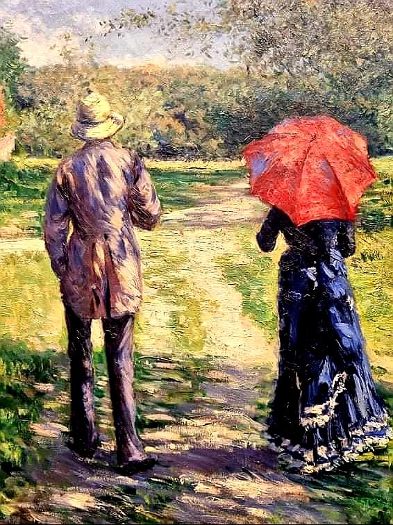(1848-1894) – besonders seine Parisgemälde sind berühmt geworden, die er oft von seinem Balkon oder Fenster aus malte – wie in seiner „Rue Halévy“ von 1877 (Detail). Aber auch das „Paar beim Spaziergang“(Detail) durch Trouville, seinem Sommerdomizil in der Normandie, zeigt seinen lichtdurchfluteten impressionistischen Stil, gesehen in der Ausstellung der Sammlung von Hasso Plattner im Museum Barberini, 10/2021