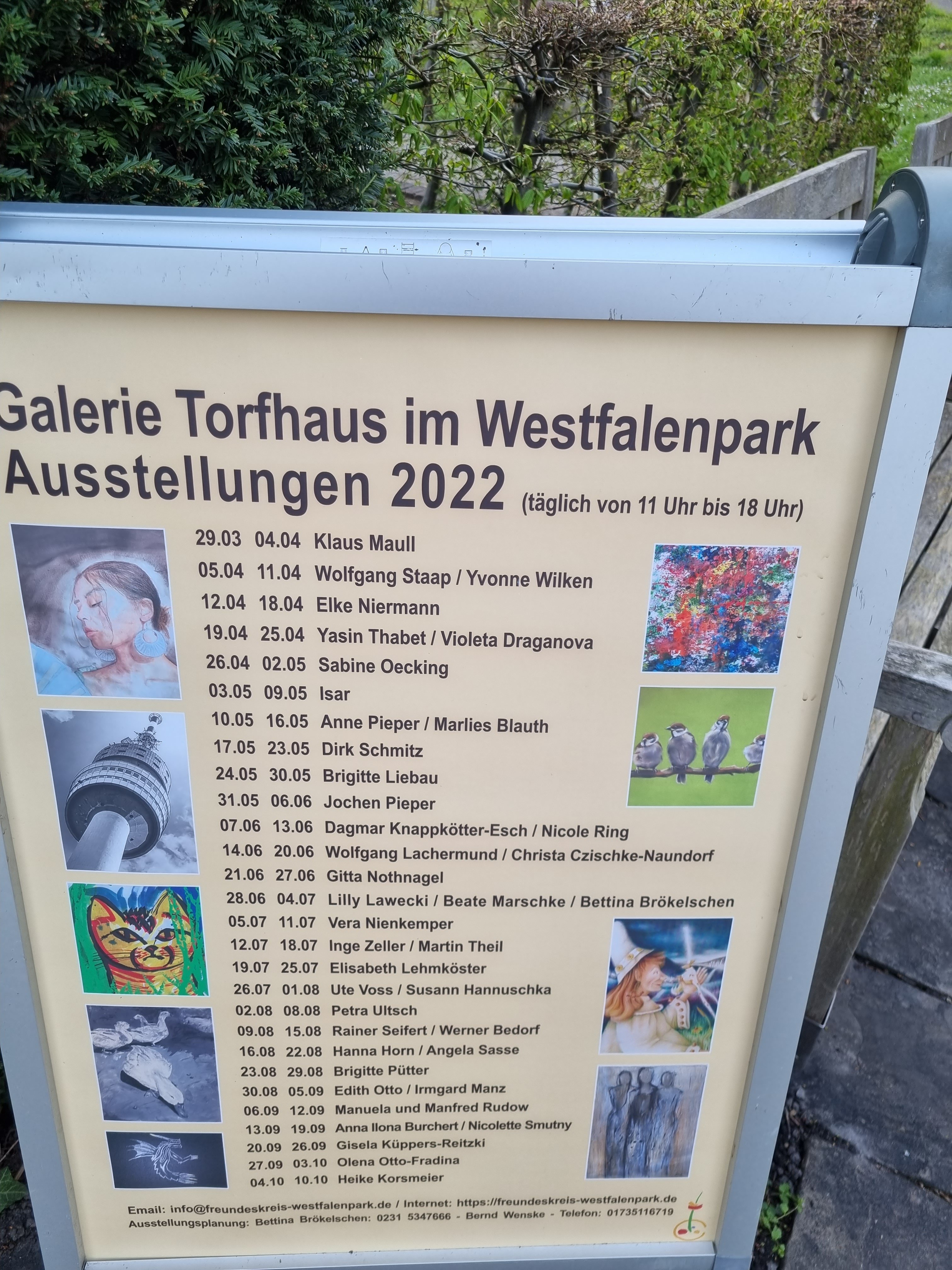 13. April 202213. April 2022 Nachlese Galerie Torfhaus: in front of ART and Nature Mensch und Tier vor Kunst und Natur – in meiner diesjährigen Galerie Torfhaus-Ausstellung im Westfalenpark Teilen mit: Klicke, um auf X zu teilen (Wird in neuem Fenster geöffnet) X Klick, um auf Facebook zu teilen (Wird in neuem Fenster geöffnet) Facebook Gefällt mir Wird geladen … Veröffentlicht von yvonnenodaywithoutfinearts Oberstudienrätin für Englisch und Französisch im Ruhestand. Kunstschaffend und -begeistert und reisefreudig Zeige alle Beiträge von yvonnenodaywithoutfinearts