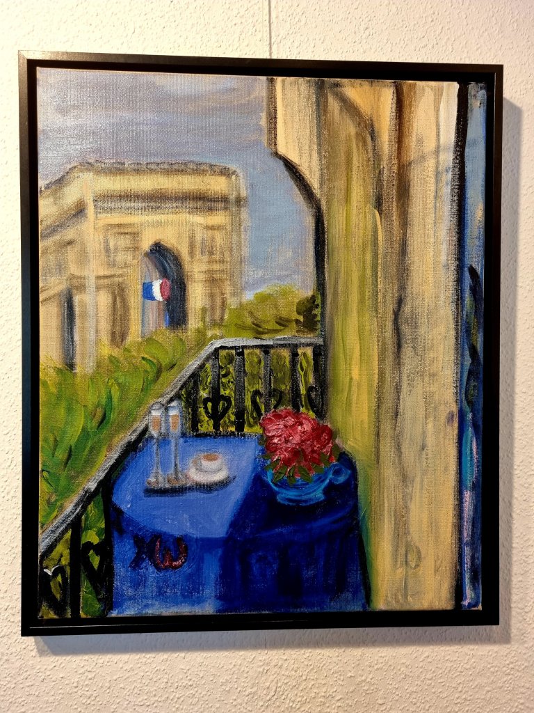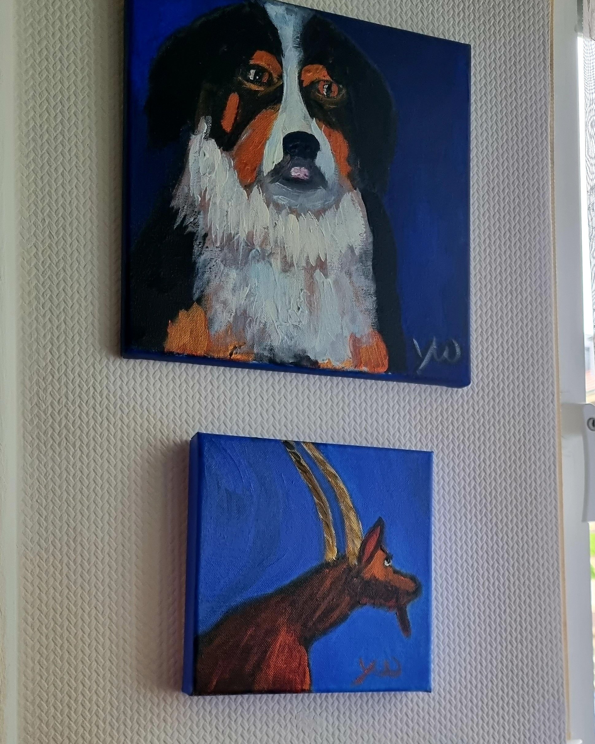 „petit déjeuner parisien“ endlich sein neues Zuhause in Köln, während die blau-silberne Heiterkeit von Kati Rakus jetzt meine Sammlung im musée yvonne ziehrt. Mit den anderen vorwiegend blauen YvonneWilkenPaintings („Berner Sennenhund“/“Steinbock“/“Nachthimmel“/“Portrait in Karlsruhe“), die schon lange in Besitz eines Blau-Sammlers sind, gab es vergangene Woche ein Wiedersehen in Essen.