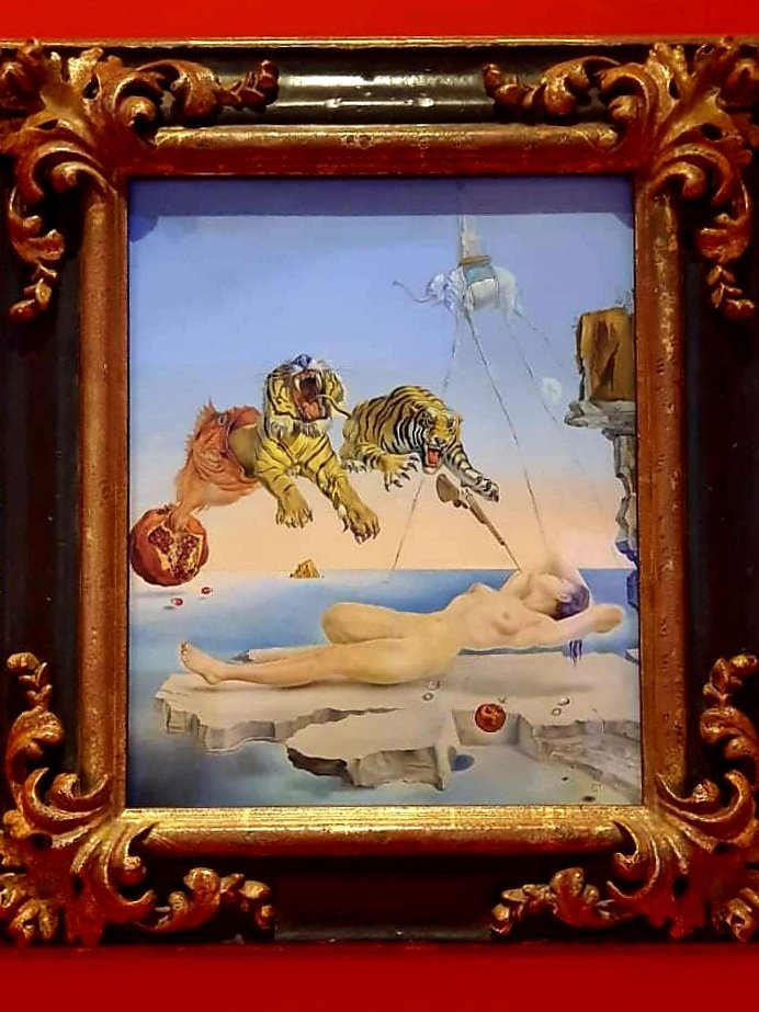 Ein sehr guter, aber auch sehr exzentrischer Künstler hatte am 11.5. Geburtstag: SALVADOR DALÍ (1904-1989), dessen Exzentrik sich auch in der Wahl seiner Titel zeigte: „das wahre Bild der Toteninsel Arnold Böcklins“ (1932), 2020 im von der Heydt-Museum fotografiert und „Traum, verursacht durch den Flug einer Biene um einen Granatapfel, eine Sekunde vor dem Aufwachen“ (1944), im gleichen Jahr im Arp-Museum in Rolandseck aufgenommen.