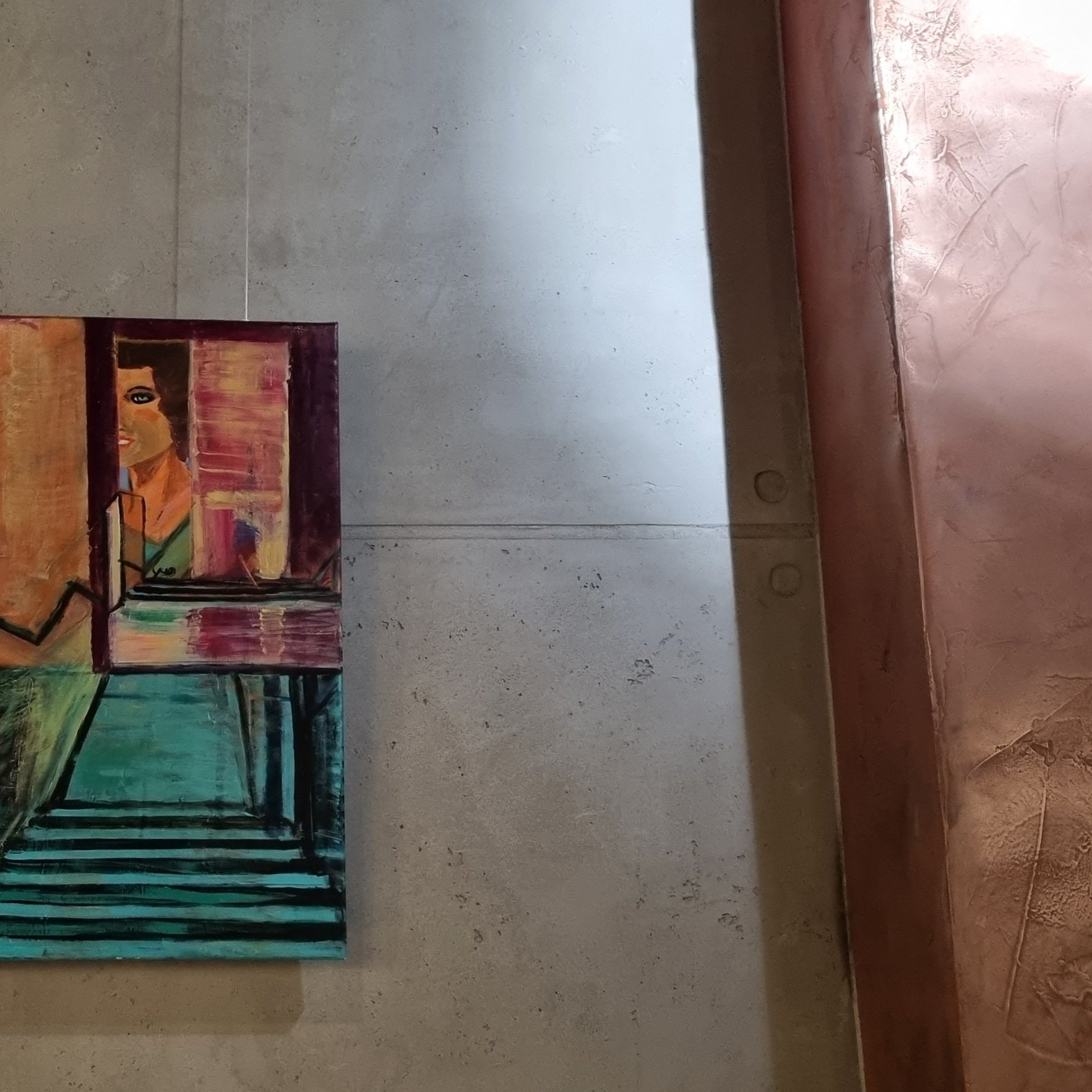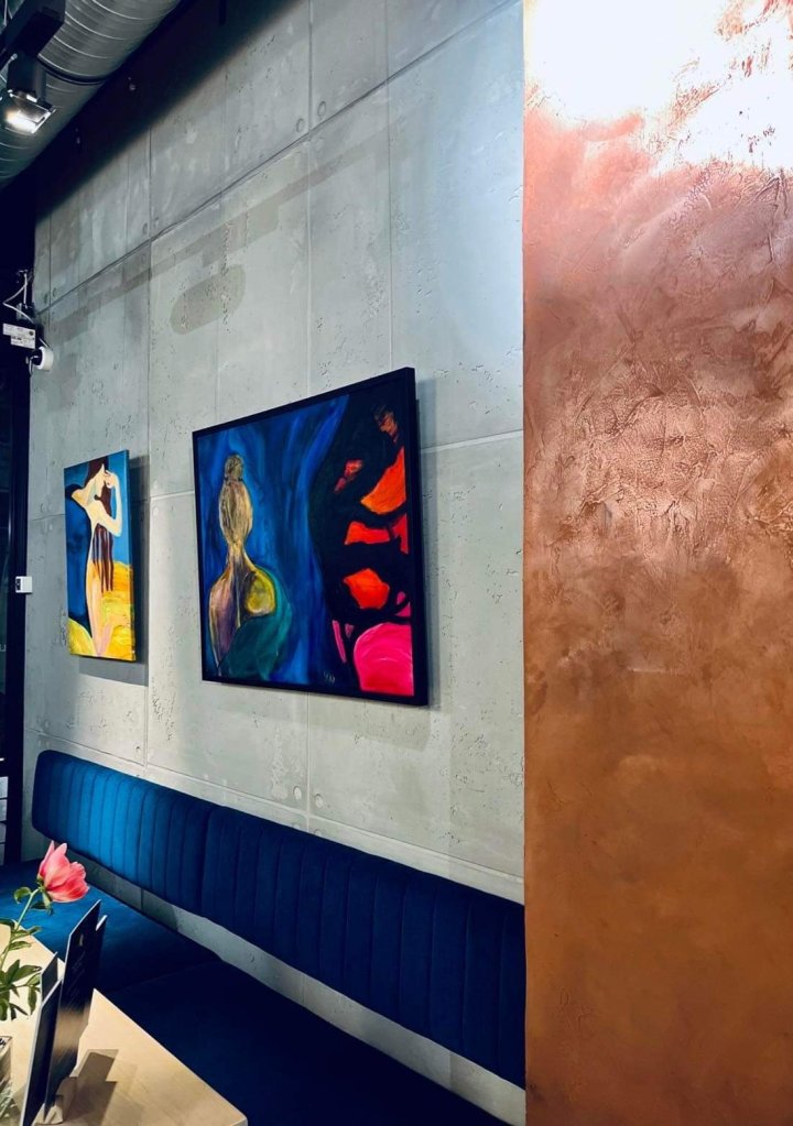 The YvonneWilkenPaintings „the threat“ and „Carol’s eyes“ on the screen in the Tana Gallery in Venice and in reality @The Pasta Heaven restaurant, Kleppingstr.22A in Dortmund