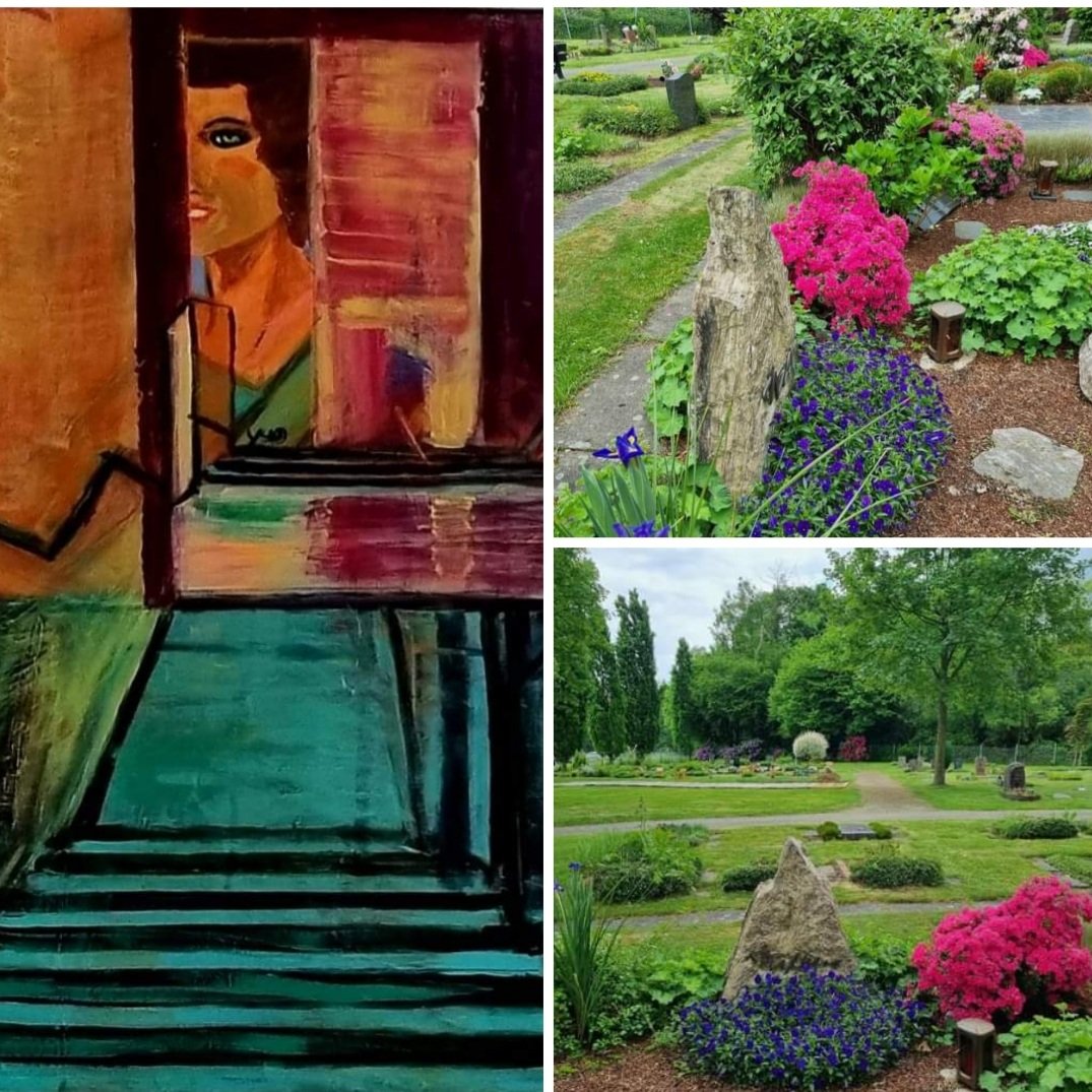 Die Inspiration für das YvonneWilkenPainting „Carol’s Eyes“, das zur Zeit im The Pasta Heaven in Dortmund hängt, war ein Foto meiner Mutter in jüngeren Jahren mit strahlendem Blick. Heute hätte sie ihren 93. Geburtstag. Passenderweise blühen rosarote Azaleen und blaue Iris gerade auf ihrem Grab.
