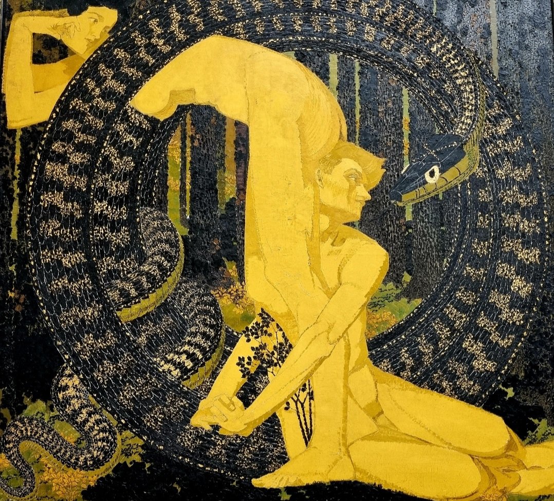 Heute vor 75 Jahren starb AUGUSTO GIACOMETTI – mit seinen farbenfrohen, symbolistischen, etwas rätselhaften Bildern mir der liebste des Schweizer Künstlertrios Giacometti (sein Bruder Giovanni als Maler und sein viel berühmterer Neffe Alberto). Ich sah seine Bilder „die Nacht“ von 1903, „Adam und Eva“ von 1907, „Kreisen der Planeten“ von 1907, und „Phaeton im Zeichen des Skorpions“ von 1911 alle zu verschiedenen Zeiten im Kunsthaus Zürich.