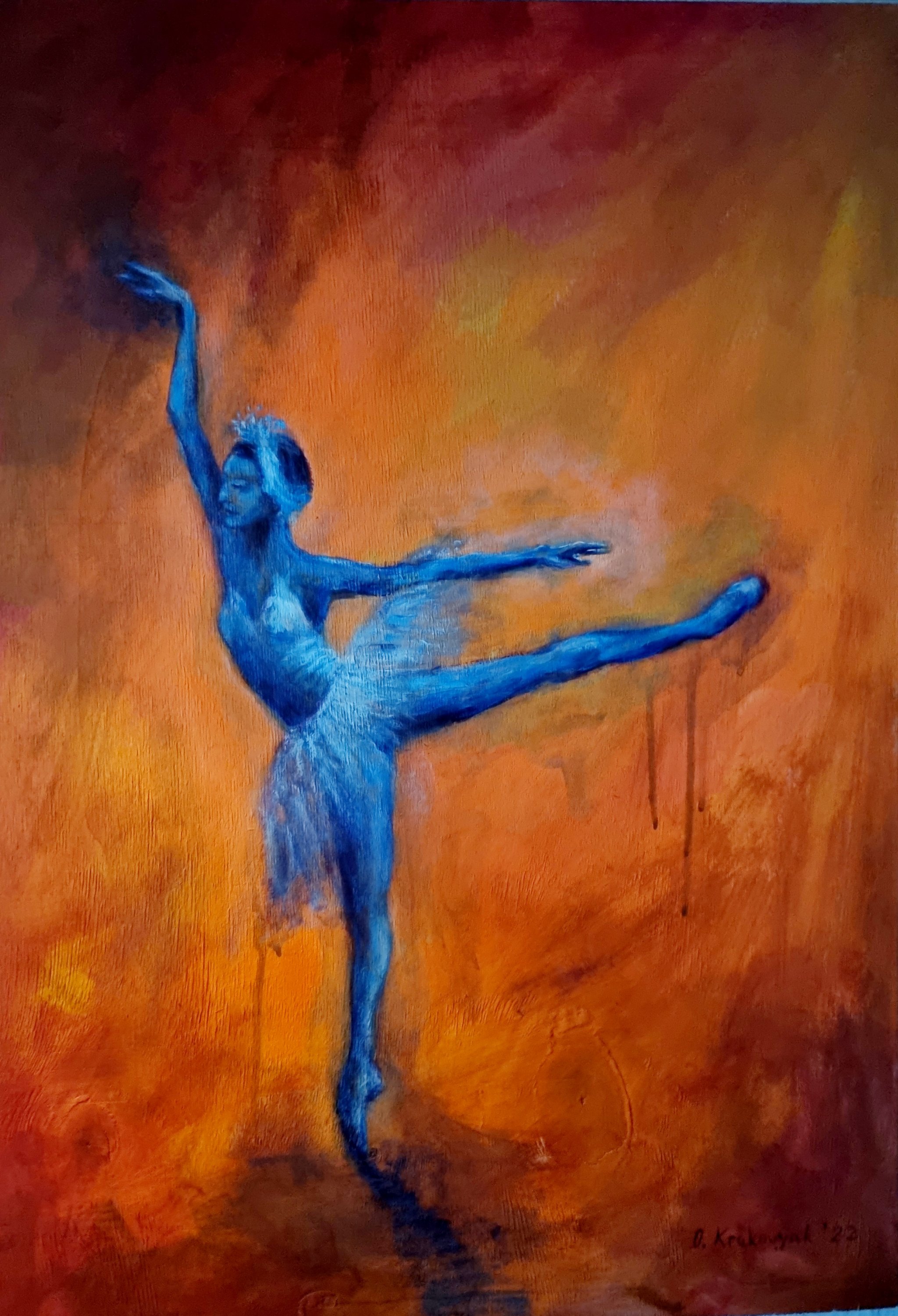 Das „Schwanensee“-Bild der ukrainischen Künstlerin hat es mir beim Besuch in ihrem Dortmunder Atelier besonders angetan, es entstand zu Beginn des Ukrainekriegs, denn die Musik von Tschaikowskys Schwanensee wird immer im russischen TV/Radio gespielt, wenn sich etwas Ernstes ereignet. Es ist also trotz der Eleganz und Schönheit der Tänzerin ein politisches Bild.