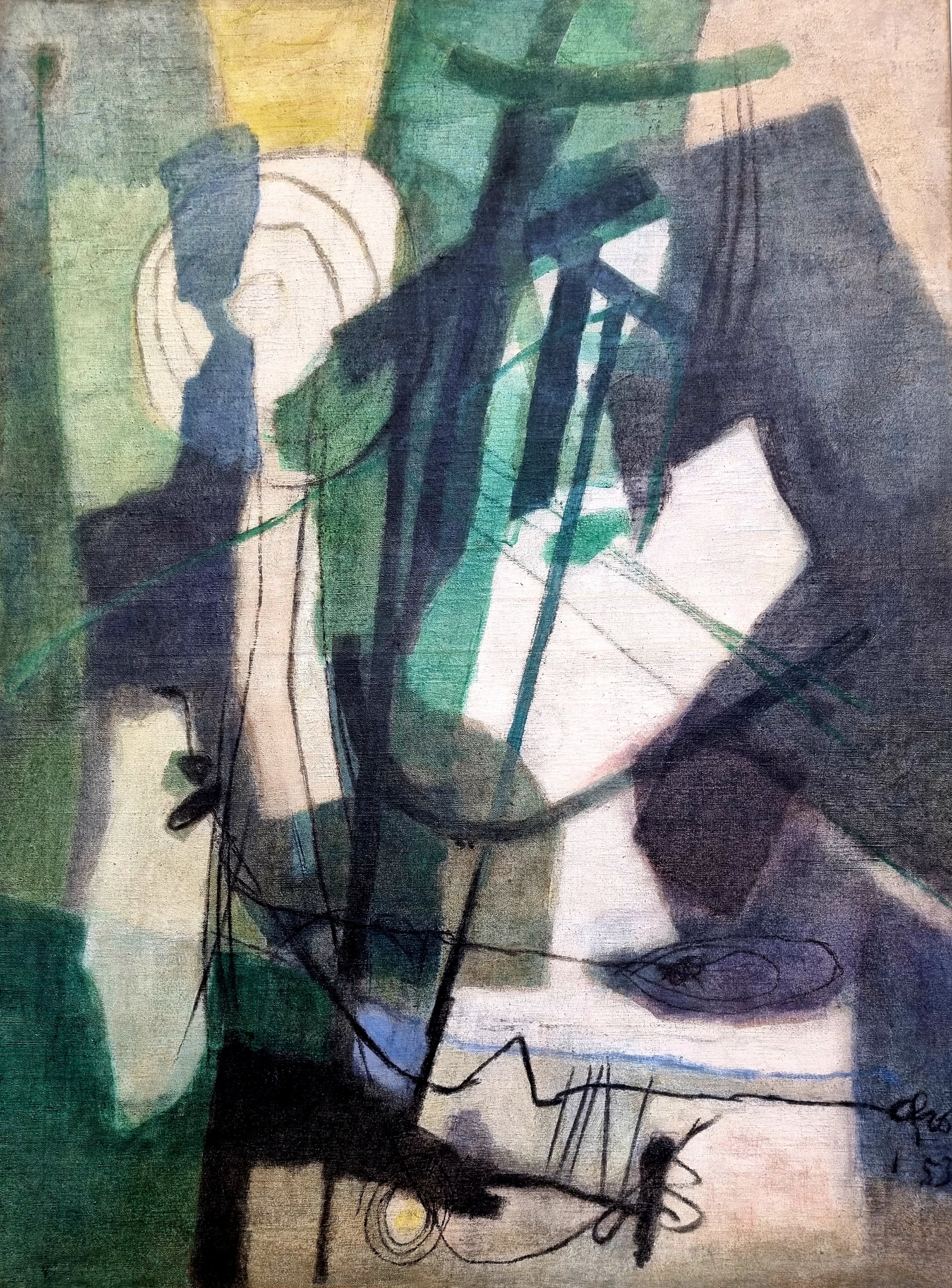 Um Silke Albrecht zum heutigen Geburtstag zu gratulieren (in diesem Jahr ein besonders hübsches Datum…2 Schnapszahlen 22.6.22), der bekennenden Liebhaberin der Farbe grün, habe ich die „Komposition in grün“ vom italienischen Maler des Informel AFRO BASALDELLA (1912-1976) aus dem Jahr 1953 ausgewählt. Ich fotografierte es am letzten Sonntag im Museum Küppersmühle in Duisburg.