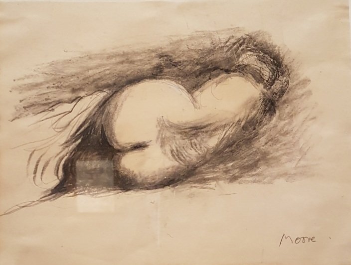*30.7.1898, (-1986) – wie man ihn kennt (Bronze „Two piece reclining figure“ von 1969) und nicht sofort erkennt (Relief „Seating and Standing Mother and Child“ von 1977 und Kohlezeichnung „Reclining Nude“ – nach Courbet von 1982): alle 3 gesehen in der bereits wundervoll betitelten Ausstellung „Henry Moore – Vision, Creation, Obsession“, 2017 im Arp-Museum Rolandseck.