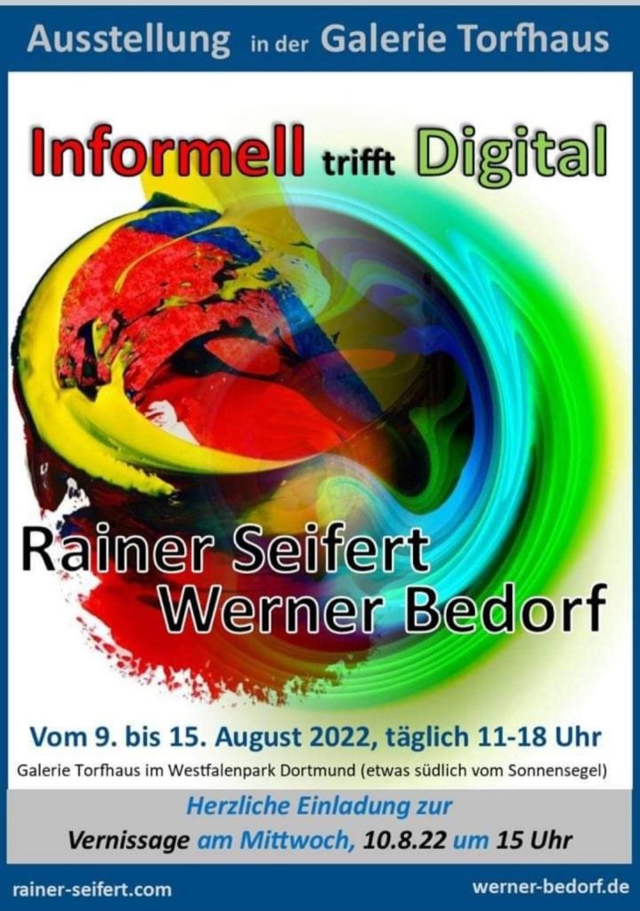 1) 10.8. Galerie Torfhaus, Westfalenpark ab 15h: Eröffnung der Ausstellung „Informell trifft Digital“ mit Werken von Rainer Seifert und Werner Bedorf und einer kleinen Eröffnungsrede von Yvonne Wilken
