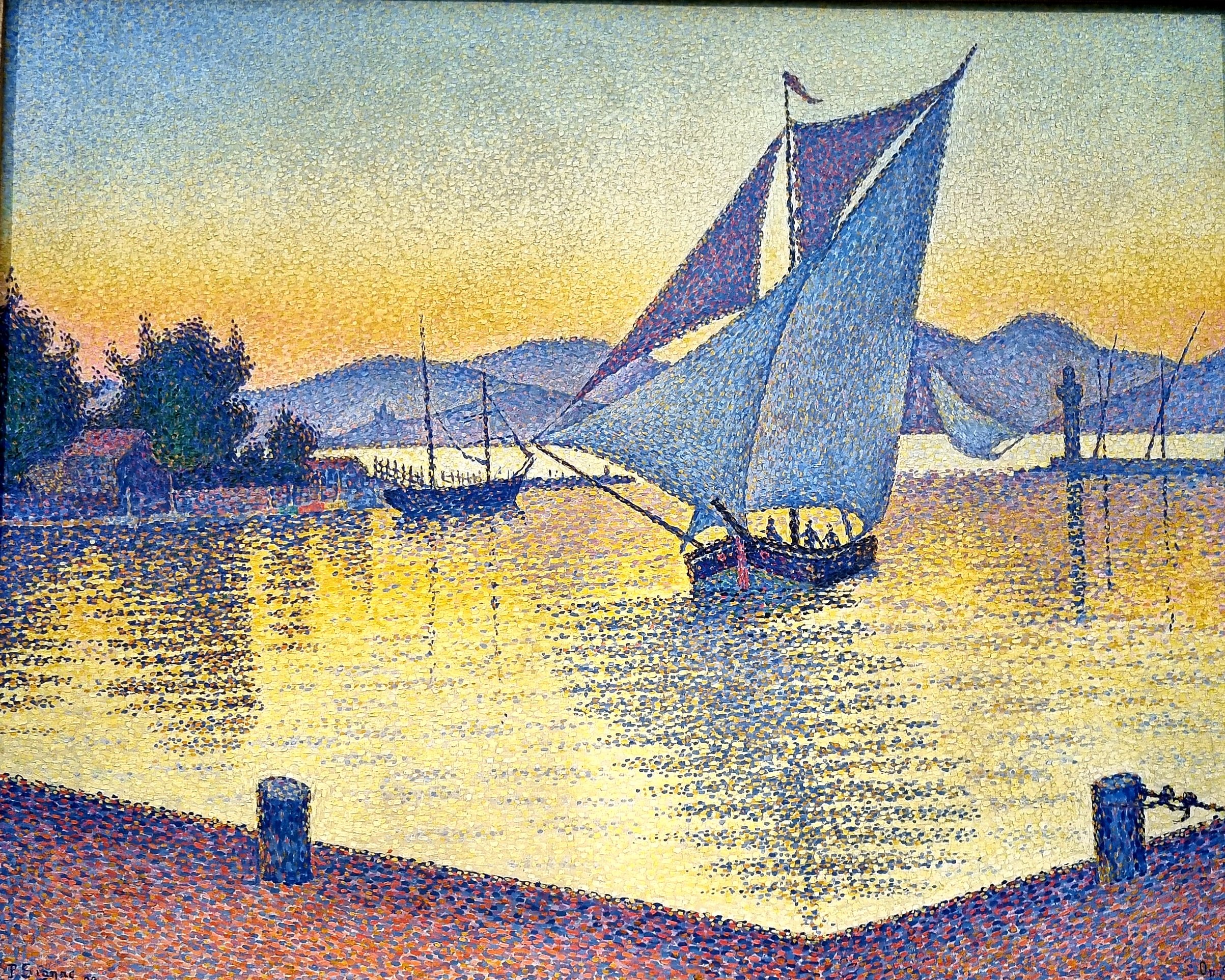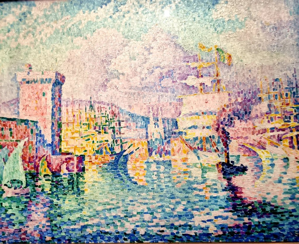 PAUL SIGNAC starb am 15.8.1935 (*11.11.1863). Er war einer der Begründer des Pointillismus und lebte zeitweise in St. Tropez, wo er immer wieder den Hafen malte (von 1892, mit blauen Segeln, gesehen im Museum Barberini in Potsdam im letzten Jahr), aber auch die türkisgrünen Segel nahe dem rosa Turm von Marseille (von 1913, gesehen im Folkwang Museum, Essen im letzten Mai) hat er wunderbar mit leuchtenden Farben in Szene gesetzt.