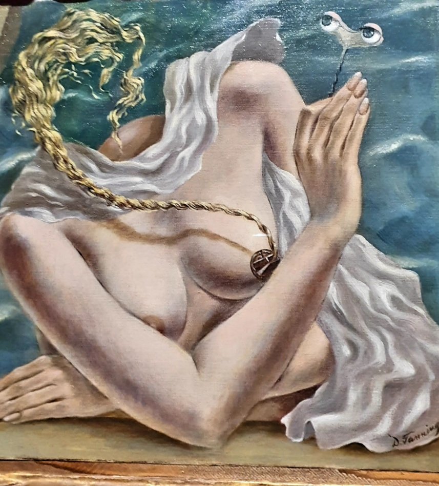 Wieviele Künstler hat der August hervorgebracht!!! Heute wieder drei am 25.8. Geborene und alle 3 mit surrealistisch anmutenden Motiven: DOROTHEA TANNING (1910-2012), die letzte und längste Ehefrau von Max Ernst, seine Muse, aber auch eine wundervolle Malerin selbst, echte Surrealistin – hier mit ihrem „Voltage“ von 1942, gesehen auf der Ausstellung der Surrealistinnen im März 2020 in der Frankfurter Schirn Kunsthalle. Der 2. Künstler, ALBERTO SAVINIO (1891-1952) wurde mehr als Schriftsteller bekannt, malte aber auch (wie sein als Maler bekannterer Bruder Giorgio de Chirico/ Savinio war sein Pseudonym). In seinem Bild „Creta“ von 1931, das ich 2018 in Rom sah, erinnerte er sich an Griechenland, die Heimat, aus der beide Brüder kamen. Mit der „Karnevaleske“ von 1974 hat auch der 3. Künstler, der Mexikaner RUFINO TAMAYO (1899-1991) an etwas Surrealistisches angeknüpft. Ich sah seine Bild in der Sammlung der Kunsthalle Würth in Schwäbisch Hall.