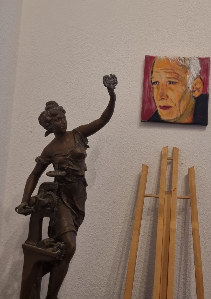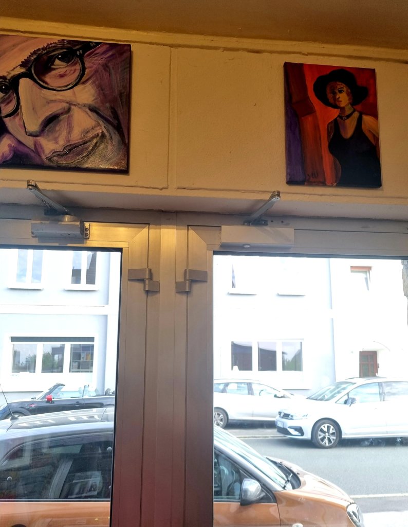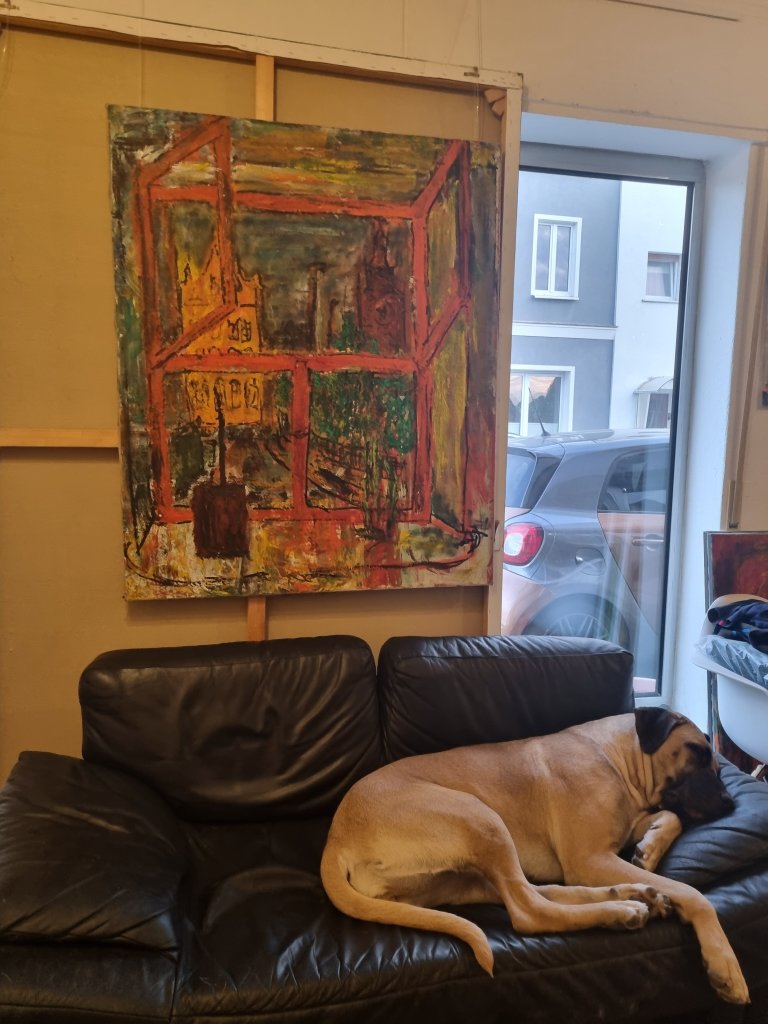 Die süße Kaya in front of ART by Kamilla Czastka (und Yvonne Wilken ). Schlafende Hunde soll man bekanntlich nicht wecken, doch Kaya hat sich so sehr gefreut, mich zu sehen, dass sie sofort bereit war zu schmusen. Sie liegt vor einem großen Danzig-Gemälde ihres Frauchens Kamilla. Doch es gibt auch noch ein paar kleinere YvonneWilkenPaintings (Portraits) in der Galerie Pic-tura in Witten, auf dem Schnee 29