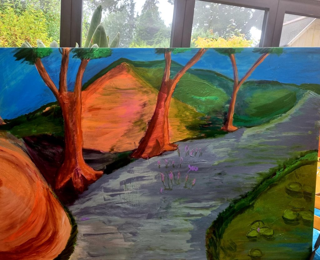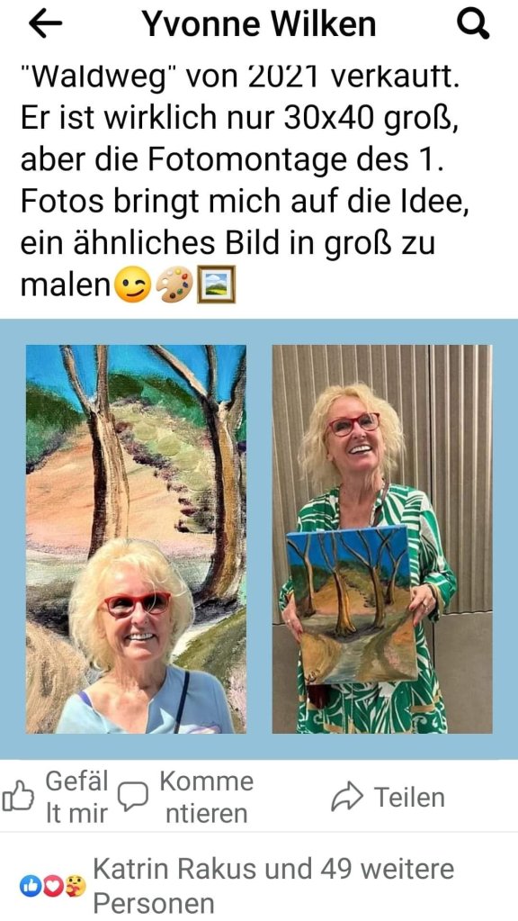 Nicht „on the easel“, sondern im Wintergarten zum Firnissen mein jüngstes Bild „großer Waldweg mit Herbstzeitlosen und Seerosen“ (Acryl auf Leinwand, 150×100) – eine Idee, die mir durch eine Fotomontage meines lieben Freundes und Sammlers Robert Kahnt kam, der ja meinen „kleinen Waldweg“ besitzt.