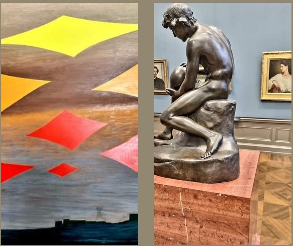 Wieder hätten 2 Künstler heute Geburtstag: die Schweizer Malerin MERET OPPENHEIM (1913-1985), deren Gesamtschau ich letztes Jahr im Kunstmuseum Bern sah – hier mit meinem Lieblingsbild „Neue Sterne“ von 1977-1982 (Detail) – und der in Marburg geborene Bildhauer ADOLF VON HILDEBRAND (1847-1921), dessen „Wasserausgießer“ von 1881/82 ich in d. Alte Nationalgalerie Berlin fotografierte.