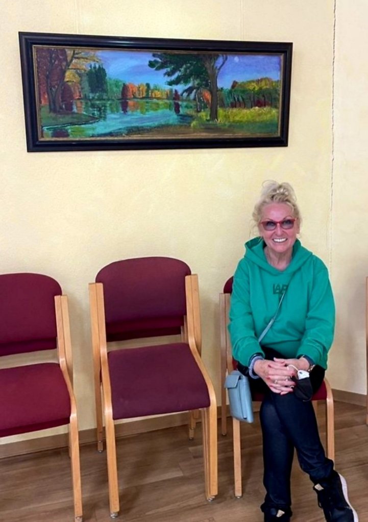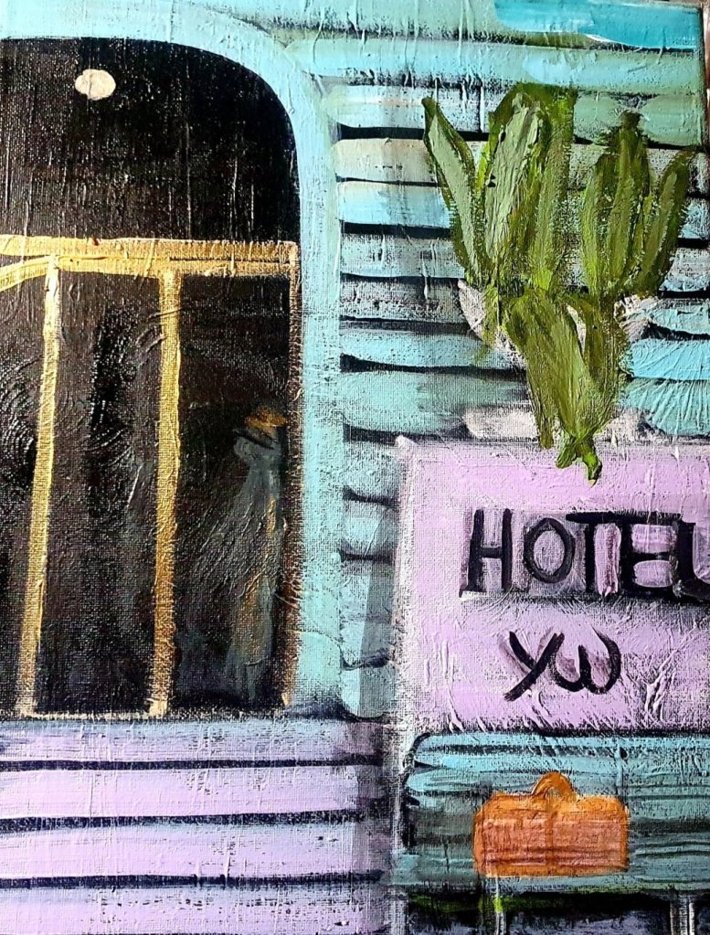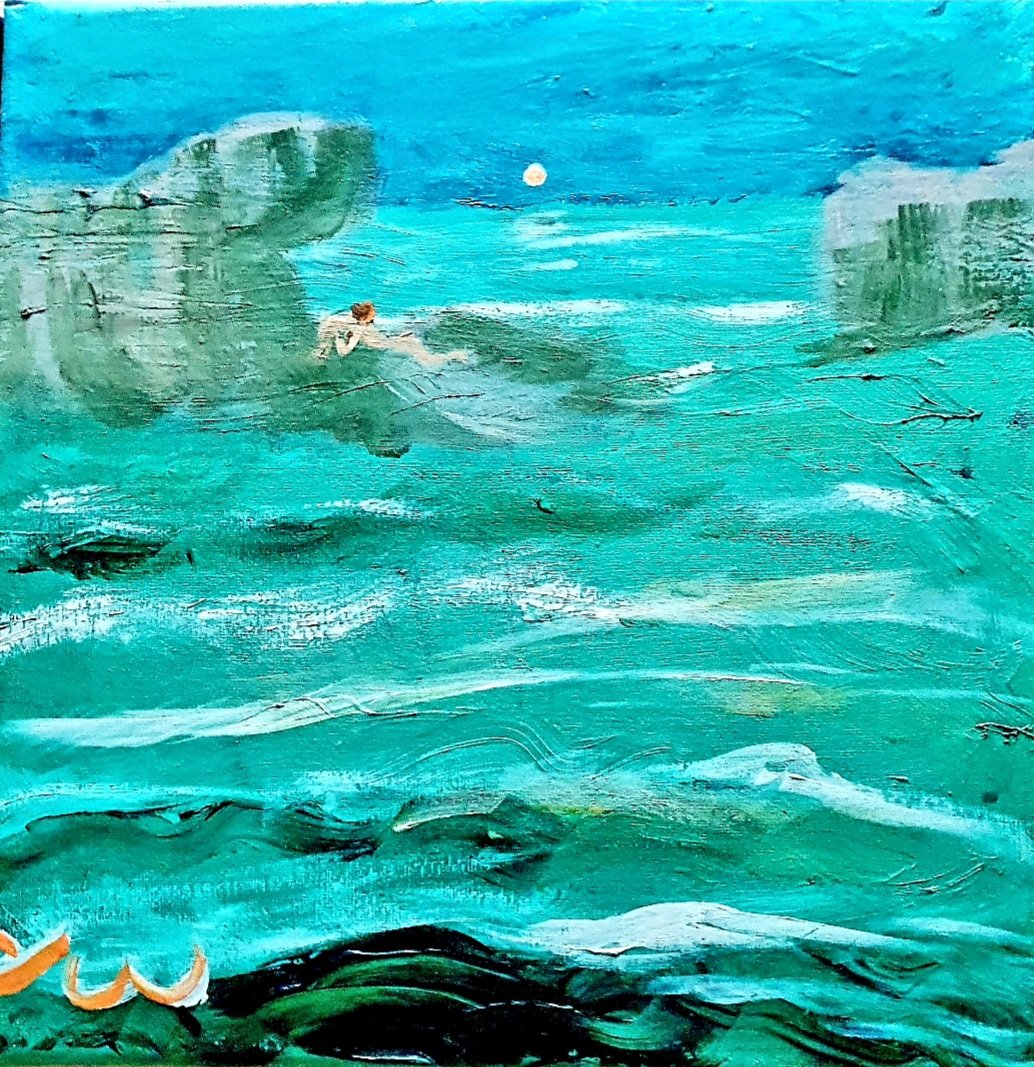 Türkisgrün durchzieht meine Bilder immer wieder: die beiden oben von 2020 („the Rocks“ und „Hotel Pastell“ ) haben in diesen Tagen ein neues Zuhause gefunden. Das Foto zeigt mich in türkisgrünem Outfit vor meinem Bild „Autumn“ von 2020 in meiner Ausstellung im Hermann-Keiner-Haus, Mergelteichstr.47