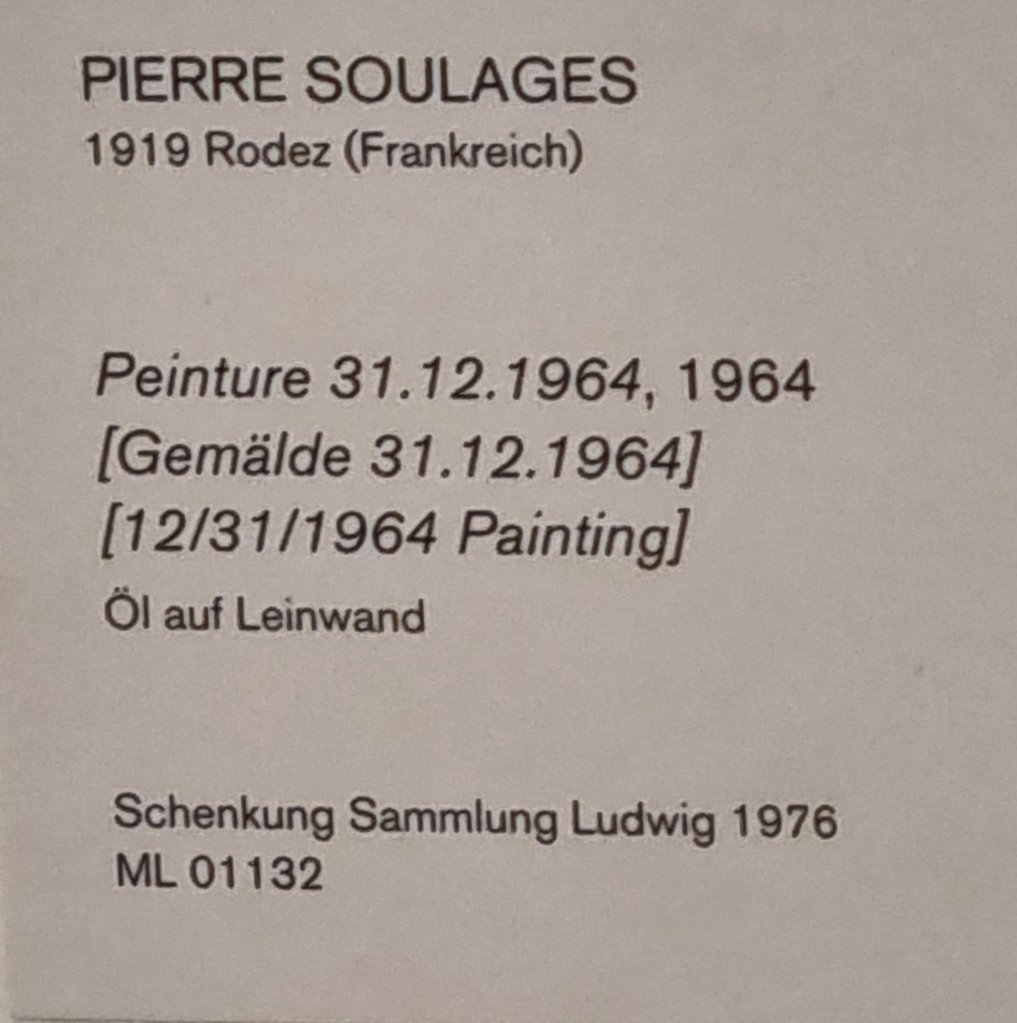 aus traurigem Grund: heute ist 102jährig einer meiner liebsten abstrakten Künstler gestorben: der Franzose PIERRE SOULAGES, der selbst schwarze Farbe zum Leuchten bringen konnte. Sein Werk zum Jahreswechsel 1964/65 sah ich noch voller Bewunderung und Vergnügen letzten Sonntag im Museum Ludwig Köln