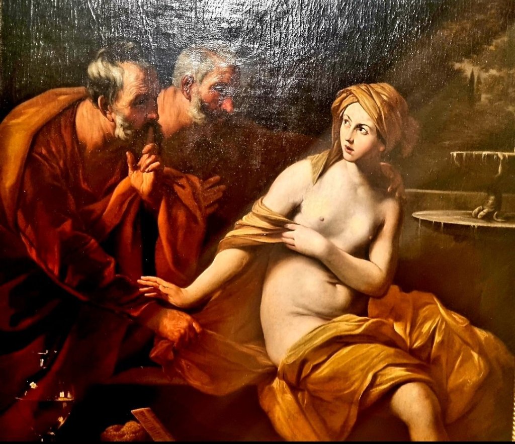 GUIDO RENI (1575-1642), italienischer Barockmaler aus Bologna, dessen Bild „Susanna und die Alten“ von 1625 zu Recht eines der ersten ist, das man in der Ausstellung „Susanna“ im Wallraf-Richartz Museum Köln sieht, hätte heute Geburtstag. Der Gesichtsausdruck der 3 handelnden Personen ist sehr genau und nachvollziehbar für den Betrachter gemalt: den „Alten“, die sich Susanna aufdrängen, sie sowohl beschwichtigen als auch beeinflussen wollen, steht eine entsetzte Susanna mit viel Würde gegenüber.