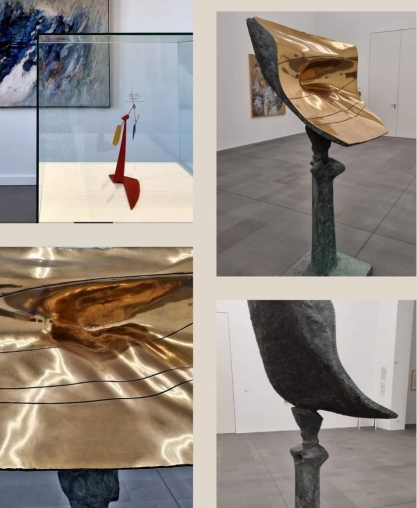 Die 2. Gruppe der heutigen Artists of the Day besteht aus 2 Bildhauern, von denen der eine – der Amerikaner ALEXANDER CALDER (1898-1976) – heute seinen 46. Todestag hat (hier im Bild vor einem Gemälde von Gerhard Hoehme im Kunstmuseum Bochum) und der andere – BERNHARD HEILIGER (1915-1995) – seinen 107. Geburtstag feiern würde. Seine Bronze „Natare I“ von 1969 fotografierte ich vor ein paar Monaten von allen Seiten im Museum Küppersmühle in Duisburg.