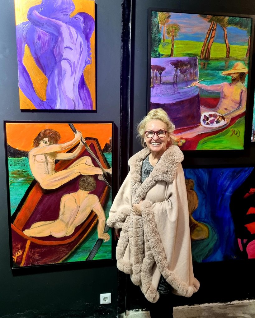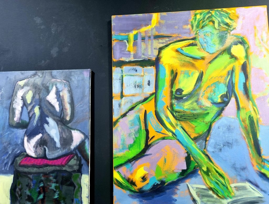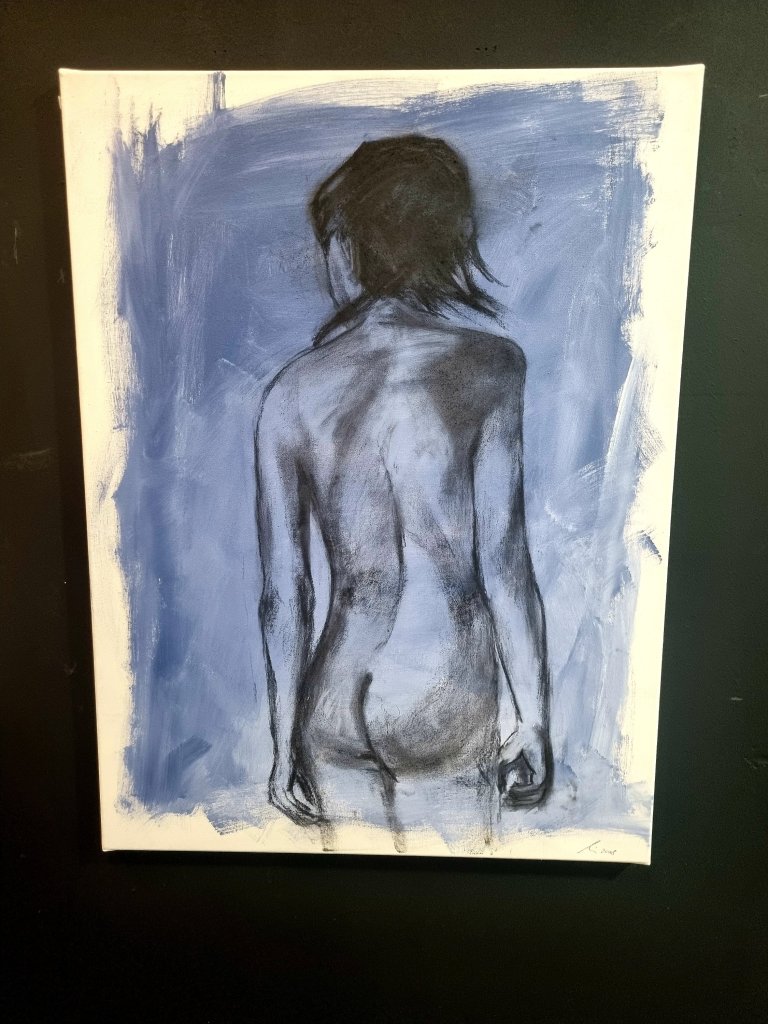 Alles am Westenhellweg 86/88 in Dortmund: eine Zeitlang war ich die einzige, die hier Akte (vor allem männliche Akte und küssende Paare – zur Zeit in lila) zeigte. Jetzt sind 2 Künstlerinnen mit bezaubernden weiblichen Akten dazugekommen: Elke Niermann in hellblau und BIRGIT MENDEL in violett-rot-blau und grün-gelb-rosé