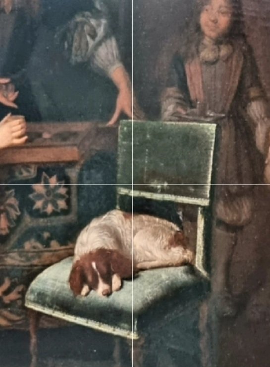 JACOB LUCASZ OCHTERVELT ein niederländischer Künstler, der am 1. Februar 1634 in Rotterdam geboren wurde und 1682 in Amsterdam verstarb. Sein kleiner Hund (Detail) stammt aus dem 1667-69 entstandenen Bild „die Backgammon-Spieler“, das ich 2021 im neuen Kunsthaus Zürich sah.