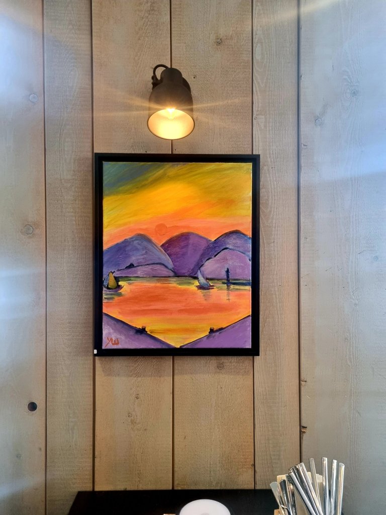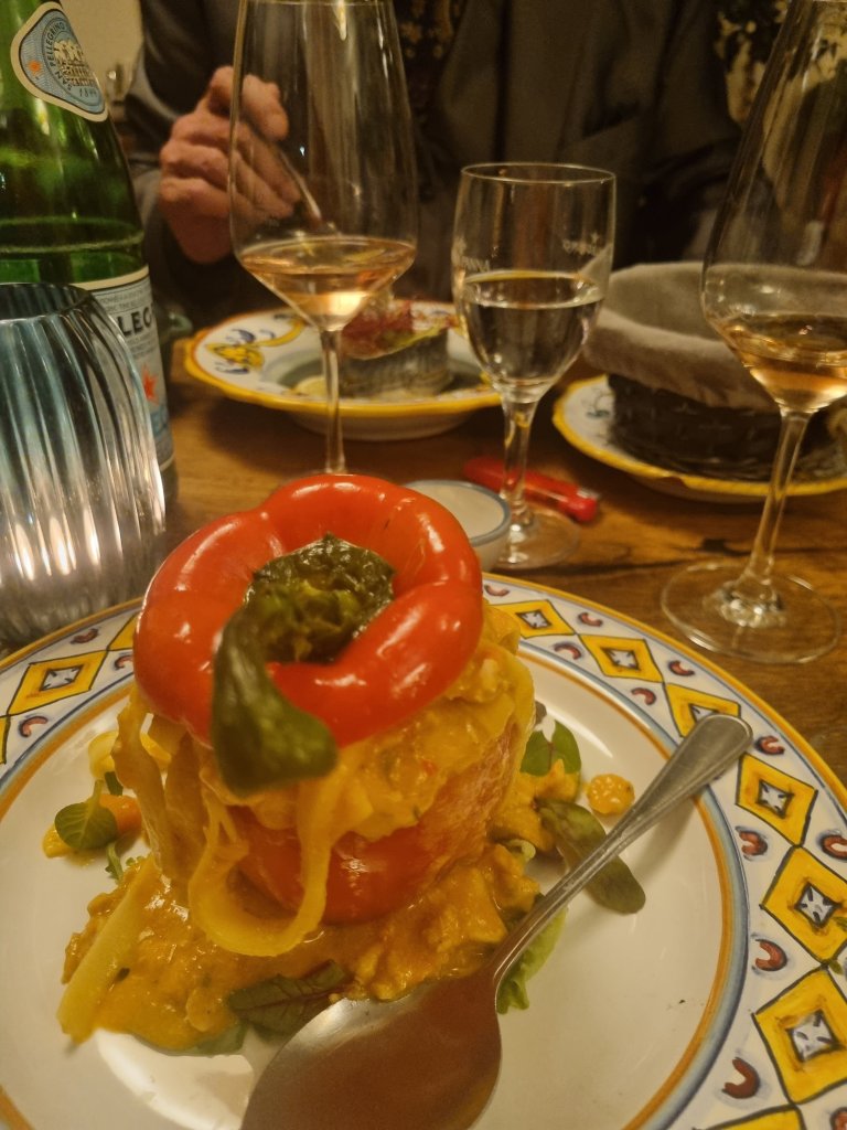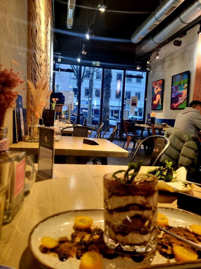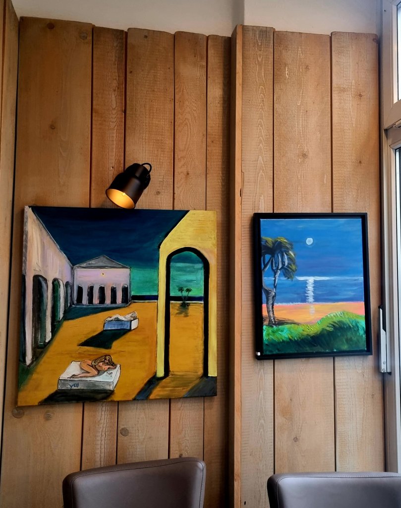 Die frisch aufgehängten Liebespaare (links als „Hommage“ an ein Gedicht von Bert Brecht, rechts „am Strand“, aus meiner Phantasie entstanden) passen ja auch zum Valentinstag, wurden aber schon am vergangenen Wochenende aufgehängt, als kleiner Austausch, provoziert vom Verkauf von „Marseille“. Dann kam noch ein bisschen Veränderung dazu, und schließlich aß ich im Lokal, wo diese Bilder von mir hängen, im Due Fratelli im Dortmunder Klinikviertel, eine wie Kunst aussehende Vorspeise. Dann ging ich weiter und nahm das sehr dekorativ aussehende Dessert im The Pasta Heaven an der Kleppingstr. Dort hängen neben Bildern von Felix Martin 3 meiner Bilder. Am nächsten Abend aß ich eine kunstvoll dekorierte Paprika im „Bruderlokal“ vom Due Fratelli: in La Conchiglia Dortmund – Kunst und Kulinarik passen eben zueinander wie ein Liebespaar am Valentinstag❣❣