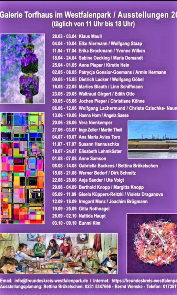 Gerade schaue ich durch die Ruhr Nachrichten – Exemplare, die sich während meiner Münchenreise stapelten, und finde einen schönen Artikel über die 45 Künstler und Künstlerinnen, die in der Frühjahr-Sommer-Herbst Saison immer je eine Woche lang in der Galerie Torfhaus, Westfalenpark ausstellen werden. Ich bin wieder mit von der Partie 😊🖼 Am 11.-17.4.23 zusammen mit Erika Brockmann . In der Woche nach Ostern. Ich freue mich❣