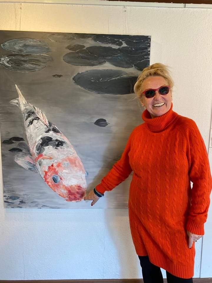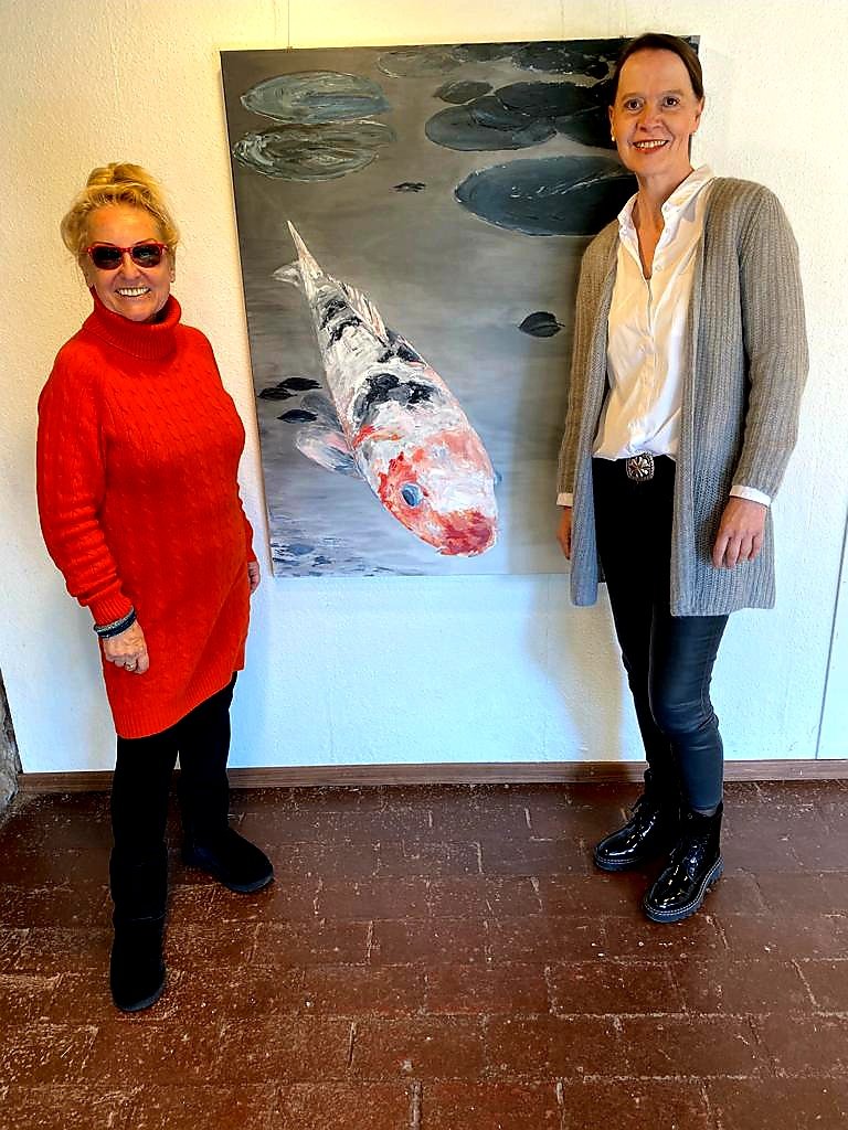 @ Galerie Torfhaus, Westfalenpark : ist der Koi nicht hübsch? Er wirkt so echt!!! Noch bis Ostermontag einschließlich zu besichtigen, bewundern und zu kaufen. Außerdem gibt es noch mehr schöne Fischebilder der Künstlerin und farbenfreudige, expressionistische Bilder des Parks von WOLFGANG STAAP.Rechts: die Dortmunder Künstlerin Elke Niermann