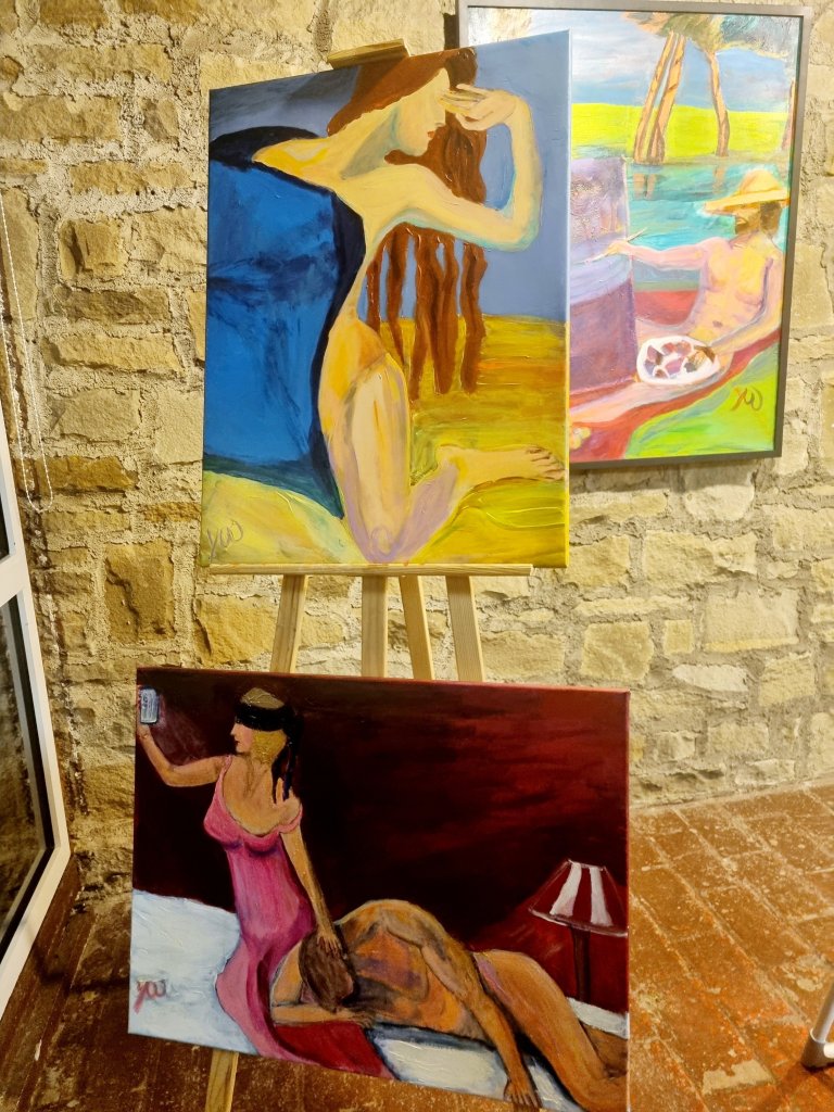 16 Gemälde und nochmal 15 Miniaturen (Sternzeichen) von mir zwischen 2019-2023 gemalt, und ebenso viele von Erika Brockmann @ Galerie Torfhaus, Westfalenpark : von heute an bis zum 17.4. sind wir, Erika Brockmann und ich dort von 11h -18h, um euch unsere farbenfrohe Kunst zu zeigen, erklären oder/und verkaufen…alles ist möglich❣️( male nudes – wie am 11. jedes Monats – und female nudes sind auch vorhanden…)