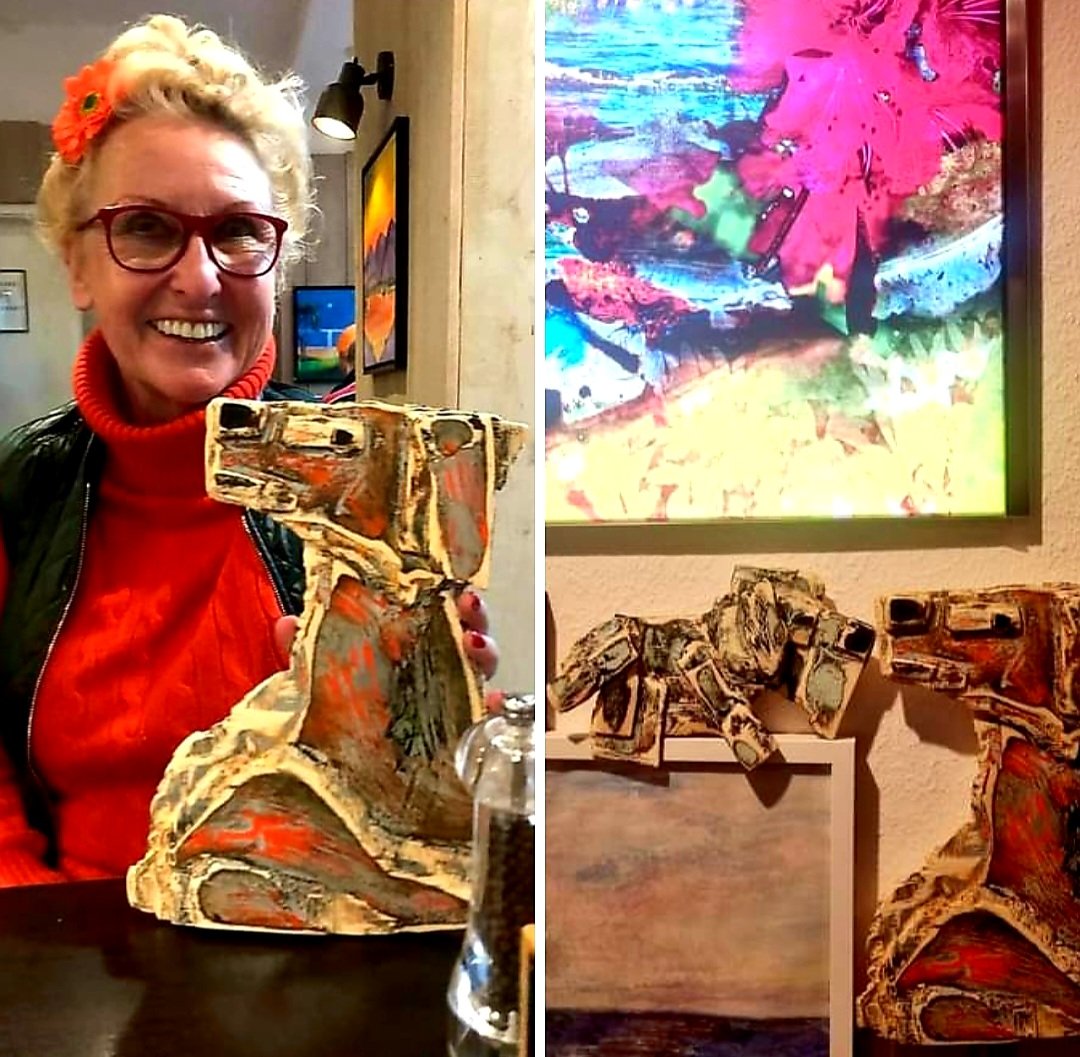 Gestern abend im Due Fratelli, wo meine Bilder hängen, bekam ich noch ein sehr schönes, verspätetes Geburtstagsgeschenk, von Thomas Hugo aus Holz kreiert und in meiner Lieblingsfarbe Orange bemalt. Er wurde am Abend von der übrigen Meute aus oder auf Holz liebevoll begrüßt und hat seinen Platz unter dem Leuchtbild von Rüdiger Philipp im Musée Yvonne.