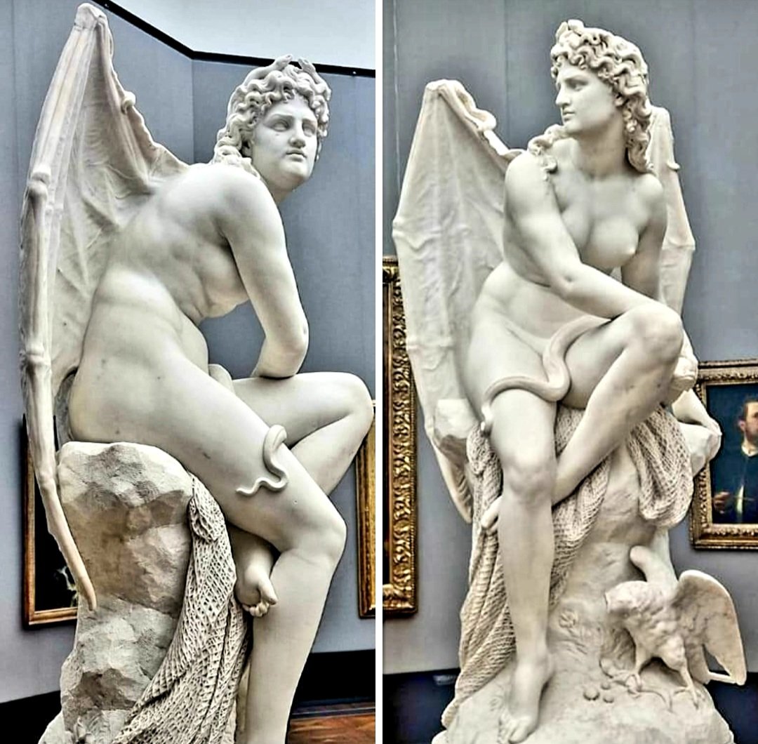 CARL CAUER (1828-1885) starb heute vor 138 Jahren. Seine „Hexe“ aus den 1870ern verwunderte mich, weil ich sie wegen der Flügel während meines Besuchs in der Berliner Alte Nationalgalerie zunächst für einen Engel hielt, doch bei näherem Hinsehen entdeckt man das Drachenartige der Flügel, die Schlange etc…