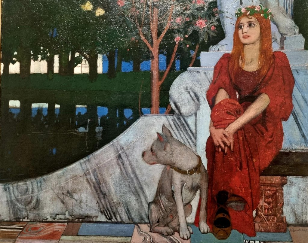 “ Weltflucht und Moderne“ im Museum Wiesbaden, in der mich sehr freute, den nicht mehr so sehr bekannten sächsischen Künstler, dessen Bilder mir 2019 in Dresden und Leipzig aufgefallen waren, mit recht großer Auswahl wiederzusehen. Das Bild, aus dem der Hund genommen ist, heißt „Sehnsucht“, wurde 1895 gemalt und kann sich auf die Sehnsucht Zwintschers selbst beziehen, denn die dargestellte Begleiterin des Hundes ist Adele, Zwintschers spätere Frau, oder auf Adele mit den großen, träumerischen Augen, bzw. auf die Sehnsucht des Hundes, der so suchend um sich schaut.