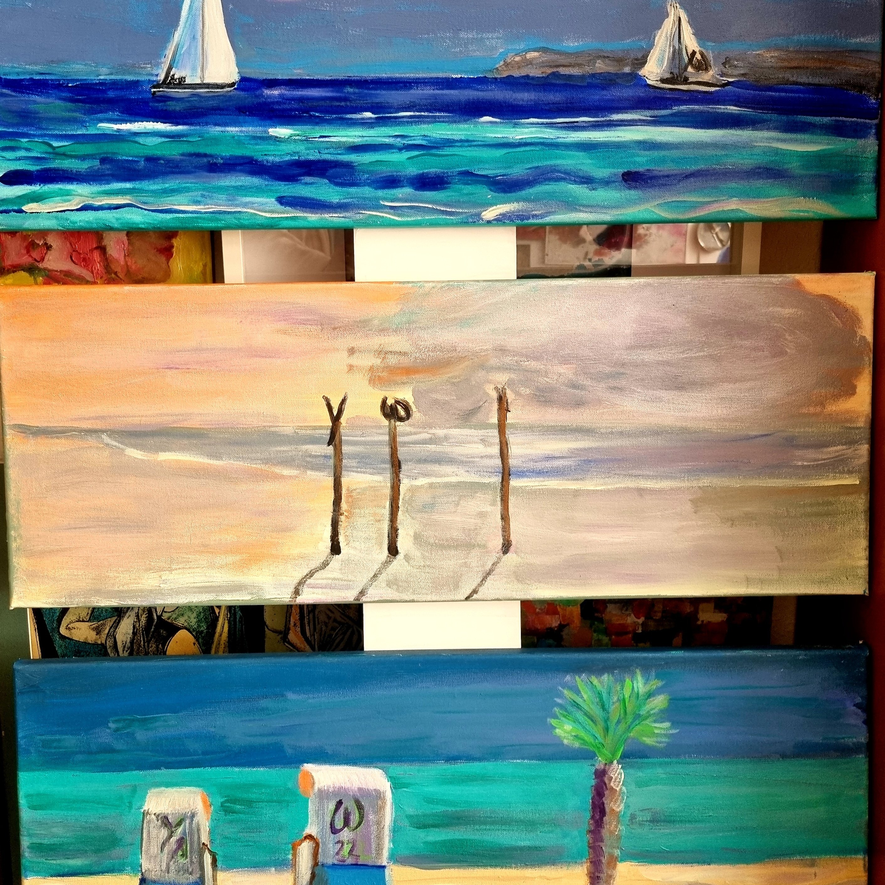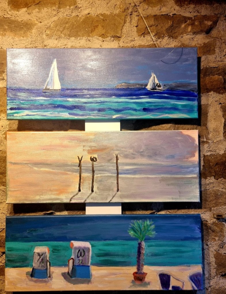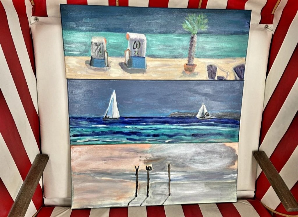 TorfhausDahmer Schaufenster an der Promenademein „Ostsee-Triptychon“, der schon in Dahme an der Lübecker Bucht ausgestellt wurde und in der vorletzten Woche in der Galerie Torfhaus, Westfalenpark, hat zur Zeit einen schönen Platz in meinem gerne von Freunden als Musée Yvonne bezeichneten Zuhause, ist aber durchaus bereit, als Triptychon oder als Einzelbild (Acryl auf Leinwand je 79×29) in eine neue Heimat zu wandern😉🖼