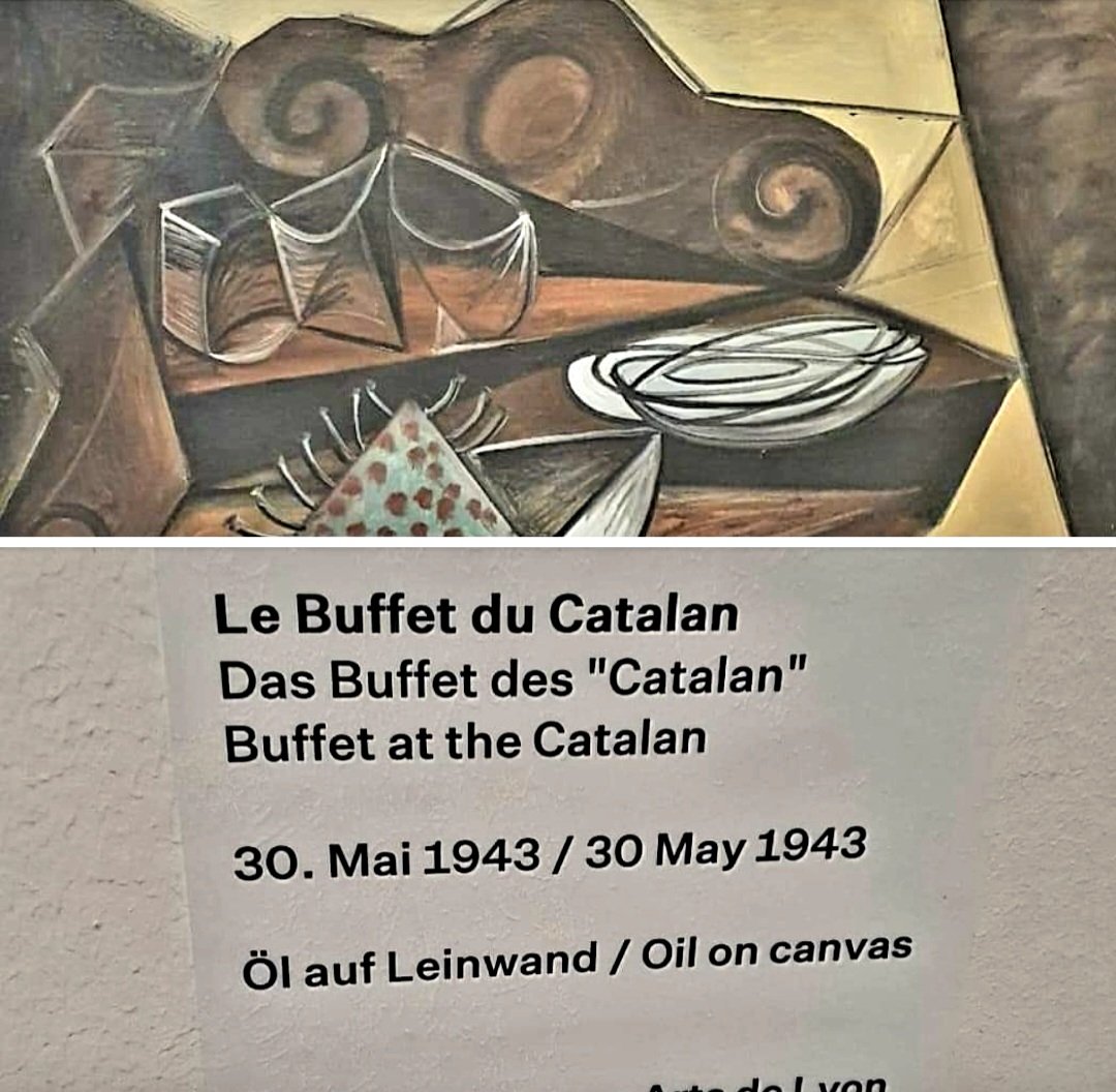 Da PABLO PICASSO seit dem Krieg dazu neigte, seine Bilder auf den Tag zu datieren, wissen wir, dass er dieses genau vor 80 Jahren vollendet hat. Es stellt eine Szene in seinem langjährigen Lieblingsrestaurant in Paris, le Catalan, dar. Ich sah das Bild 2020 in der Düsseldorfer Ausstellung im K20 Kunstsammlung NRW mit dem Namen „Picasso. Kriegsjahre 1939-45“